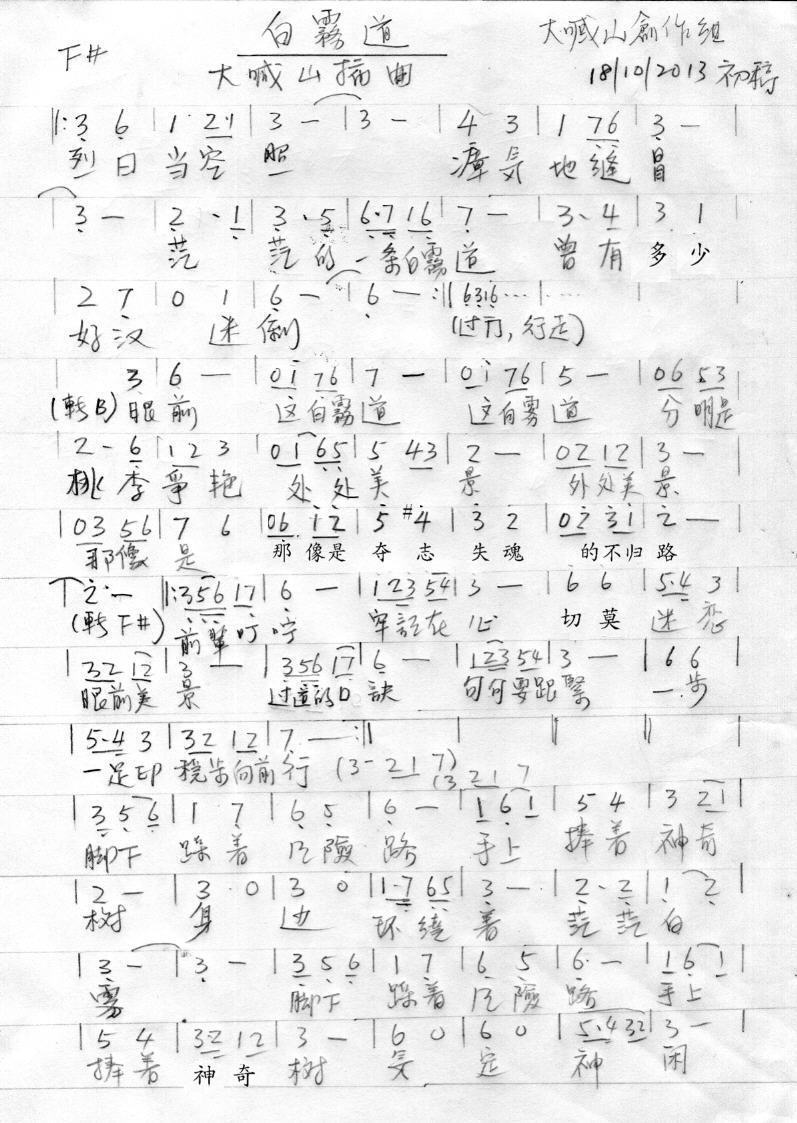 就如歌中所唱的, 白霧道雖然有風險, 只要牢記先輩的教誨和過道的口訣,藹也能平安過去的, 這歌從歌紙看已經是三年前寫的, 過後就忙於搞演出, 荒廢了創作, 如今已是農閒時期, 吃包組在吞下一粒包之後就把合唱部分給唱出來了, 獨唱就以後再說了, 如果高山有歌手要幫忙唱我就省下不少買包的錢可以買零件組裝多幾台wireless-midi.