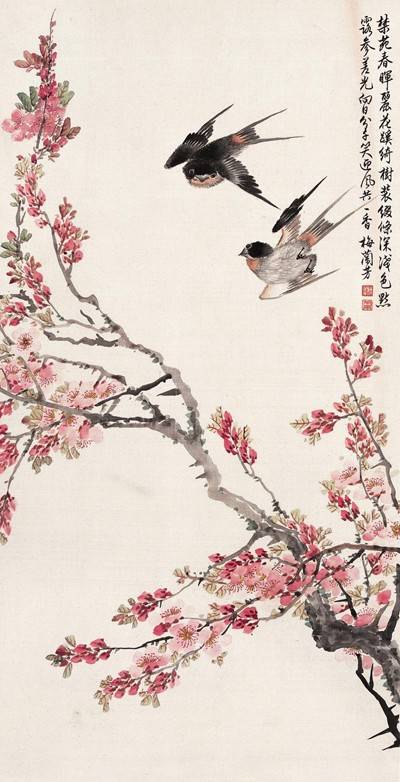 1913年11月,梅蘭芳應邀首次赴上海演出,先後結識了吳昌碩等一些繪畫名家,他們常常同席聚會,談詩論藝。第二年12月,梅蘭芳又去上海演出,《時報》主持狄楚青特意為梅蘭芳接見,並請吳昌碩、朱古微等名流一起赴宴聚會。宴席上,吳昌碩對梅蘭芳說:“畹華,你這次來,我要好好地給你畫一張着色的紅梅。在你回去之前,我一定畫好了送過去。”