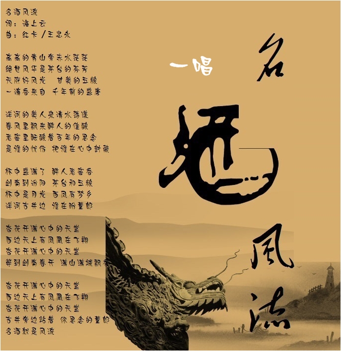 川江號子首唱:http://www.bbsland.org/upload_music/8806528.mp3 伴奏bE: http://www.bbsland.org/upload_music/8806784.mp3 伴奏D:http://www.bbsland.org/upload_music/8807040.mp3 伴奏C:http://www.bbsland.org/upload_music/8807296.mp3 張志良老師範唱 D調:http://www.bbsland.org/upload_music/8807552.mp3 《名酒風流》 作詞/製鐵:海上雲 學唱:一唱 引子(哼唱) 高高的青山旁赤水茫茫 洋河的美人泉清水蕩漾 rap (說唱) 杏花開滿心中的天堂 杏花開滿心中的天堂 京劇念白: