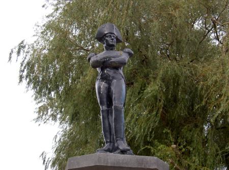 狮子村村口的拿破仑塑像。这位一向高傲自大的法国皇帝,身着戎装,身体略微侧斜,两臂交叉抱胸,两眼直视前方。那神态潇洒自信,俨然一副目空一切的胜利者姿态。