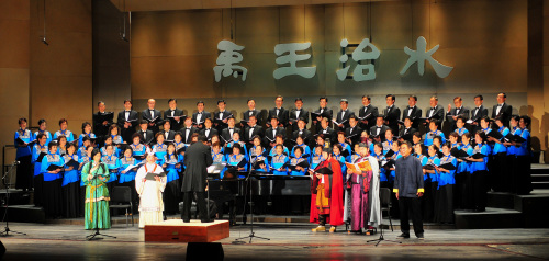《禹王治水》 五、禹頌 過客詞 鮑元愷作曲 清羽合唱團首演 2008-11-30 美聲兒童合唱團、奧菲斯兒童合唱團參演 丁國勛指揮 潘琳伴奏 林艷雲、方麗婭、楊民升、黨偉光獨唱、領唱 朗誦:過客 【說書】三過家門而不入,生下兒子也顧不上管。禹爺治水十三年,到底率眾人平了水患。這世界上許多的古老文明,都經歷過“大洪水”的災難。人們要麼苦捱,等洪水自退;要麼祈禱,求上天垂憐。自力更生、戰勝洪水的,只有我們的祖先! 百川東入海,地平天成。 登會稽,朝諸侯,誅防風。 明德播海內,鳳凰來儀、 堯之都,舜之壤,禹之封。 順水性,平水患,聖人法自然。 順水性,平水患,眾手可回天。 歷艱危,經磨難,薪火代代傳。 天佑中華,河清海晏; 天佑中華,國泰民安。 【簡注】 “地平天成”:《尚書?大禹謨》:“帝曰:‘俞!地平天成,六府三事,允治。萬世永賴,時乃工。’” “登會稽,朝諸侯,誅防風”:事見《吳越春秋·越王無餘外傳》。 “明德”:語出《左傳》昭公元年:“美哉禹功,明德遠矣。微禹,吾其魚乎!” “鳳凰來儀”:《尚書·益稷》:“鳥獸蹌蹌,簫韶九成,鳳皇來儀”。 “堯之都,舜之壤,禹之封”:宋陳亮《水調歌頭·送章德茂大卿使虜》換片首句。 “聖人法自然”:《道德經》:“人法地,地法天,天法道,道法自然。”