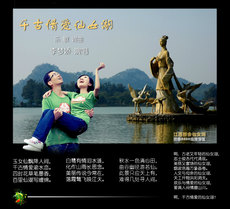 《千古情愛仙女湖》(民歌特徵)是一首我暑期寫的歌曲,由上海師大民族聲樂專業的研究生李夢嬌演唱。她04年榮獲第四屆全國電視“希望之星”大獎賽江西賽區聲樂組第一名,同年赴京參加全國總決賽榮獲全國“十佳”歌手獎。