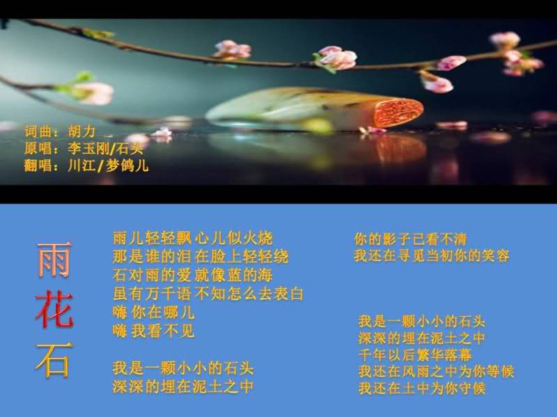 ![]() 《雨花石》 作詞:胡力 作曲:胡力 雨兒輕輕飄 心兒似火燒 我是一顆小小的石頭 我是一顆小小的石頭