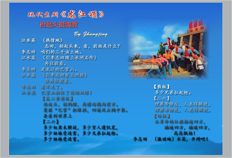 京劇《龍江頌》出現於文革後期,原不屬於樣板戲,但其普及程度並不比樣板戲遜色, 其中的好幾個唱段幾乎人人會唱。相比之下,學唱《抬起頭挺胸膛》的人並不多,而這段唱對我卻有特殊的意義,因為這段唱曾伴我經歷過艱難時光。 那時我因為家庭出身問題,成了狗崽子,再加上幾個坐在教師位置上的人落井下石,精神上時時感到壓力重重。幸而有一些工農家庭出身的朋友一直在幫助我,鼓勵我,我才不致崩潰。“抬起頭,挺胸膛,高瞻遠矚向前方。莫叫巴掌把眼擋,四海風雲胸中裝”這幾句唱腔也經常被我掛在嘴邊。 現在看來,這段唱腔里基本都是空話假話和口號。 但那時我還處於懵里懵懂的年齡,似乎唱一唱心裡就會產生一些希望,心裡的壓力也能減輕一些。