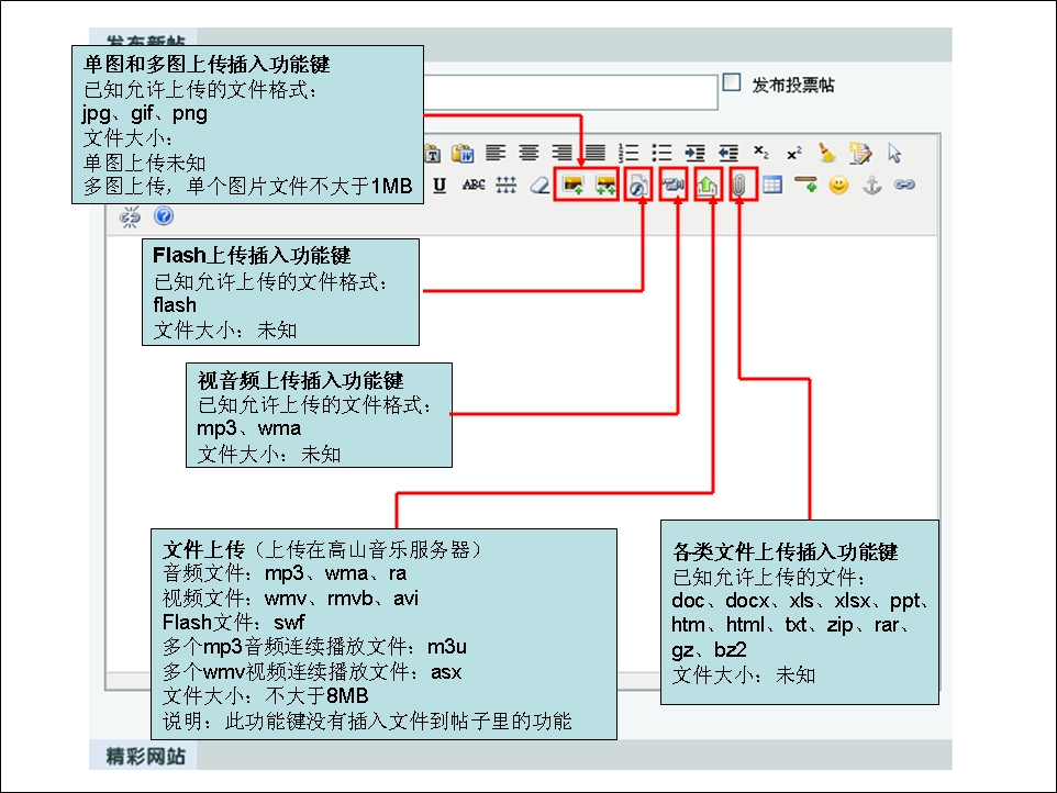 说明: 这些功能键中,除了从文件上传处上传的文件是上传到高山音乐服务器的,即域名为:http://www.bbsland.org 从单图、多图、flash、视音频和各类文件上传这些功能键上传的文件都是上传到万维网站服务器的,即域名为:http://bbs.creaders.net