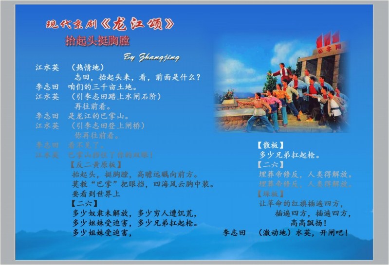 京劇《龍江頌》說的是一九六三年春,福建某地遭遇特大乾旱, 龍江大隊黨支書江水英堅決執行縣委指示,為幫助遭受旱災的地區,在自己的家鄉堵江分水,捨棄了自己的三百畝高產田,解救了災區九萬畝受旱土地。這段《讓革命的紅旗插遍四方》(又名《抬起頭挺胸膛》)是江水英說服大隊長打開閘門給後山送水時唱的,也是江水英在全劇中的最後一段唱。