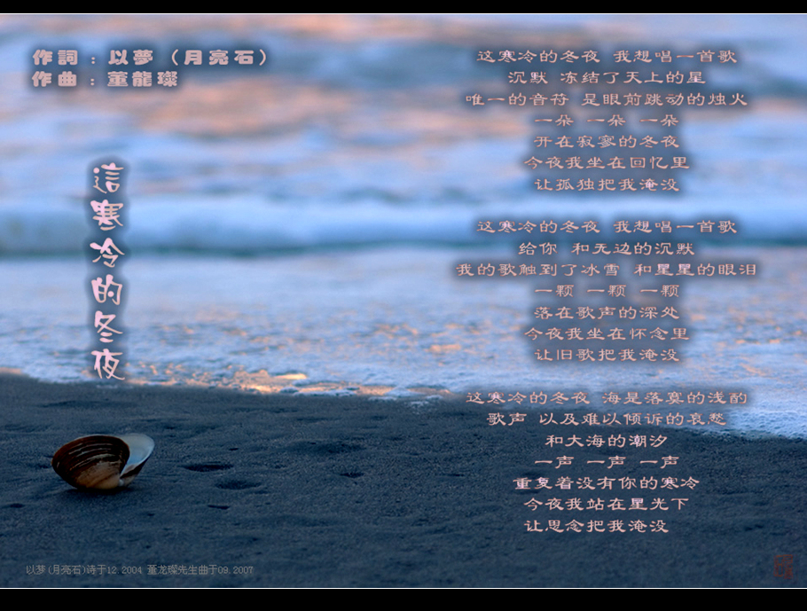 非常喜欢董老师的歌。旋律美,易上口。专业的作曲和编曲,给了歌手一个发挥的空间。因为董老师来高山,常和山民合作,更有种亲近感。董老师的好几首歌,听了就有想唱的冲动。'寒冷的冬夜'听了后,跟着范唱消了音就唱了。这次搞原创活动,俺学歌慢,新歌来不及录,就把唱过的再录了一遍,和大家一起参与原创活动。 |