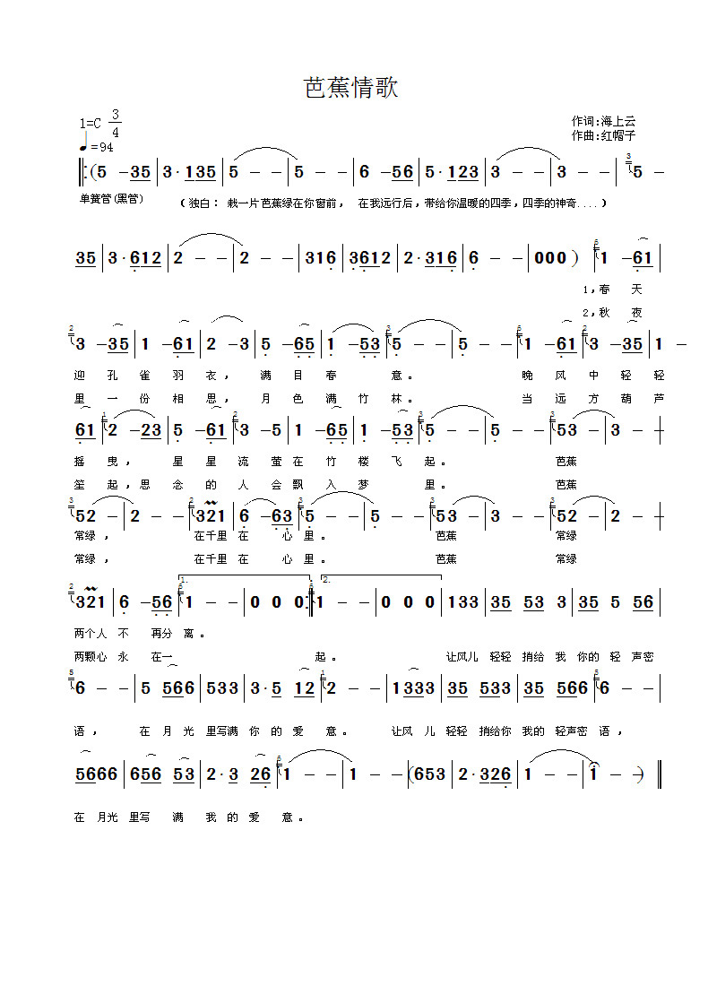 【原創】《芭蕉情歌》海上雲詞,紅帽曲,樹燁子試唱