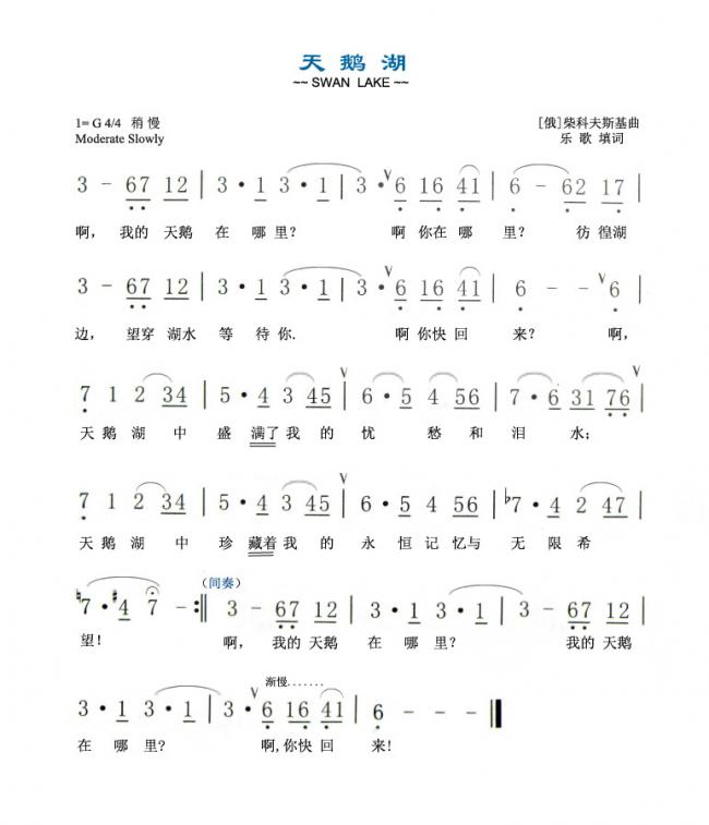 俄国作曲家柴可夫斯基(1840-1893)所作的不朽的芭蕾舞音乐《天鹅湖》,是人类文化艺术的宝贵遗产。自很多年前听到《天鹅湖》主题曲时,就被其美妙动人的旋律感动不已。天鹅湖组曲里有很多非常动听的音乐,如《圆舞曲》、《四小天鹅舞》、《西班牙舞》、《那波里舞》等。但《天鹅湖》主题曲,不仅好听,也富有歌唱性,其旋律像心中的歌常在耳边回响。近期把《天鹅湖主题》填词,终于如愿将其成歌。谨以此帖纪念伟大的音乐家柴可夫斯基逝世一百二十周年!