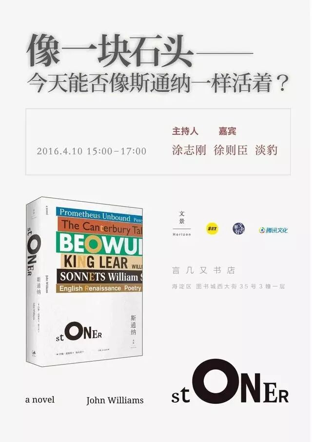 像一块石头:今天能否像斯通纳一样活着?丨沙龙预告线下沙龙主题 像一块石头 ——今天能否像斯通纳一样活着? 时间:2016年4月10日(星期日) 15:00—17:00 地点:言几又书店 海淀区 图书城西大街35号3幢一层(中关村创业大街内) 主持人: 涂志刚(前《新京报·书评周刊》主编) 嘉宾: 徐则臣 (作家,1978年生于江苏东海,毕业于北京大学中文系。著有《耶路撒冷》《午夜之门》《夜火车》《跑步穿过中关村》《到世界去》等。曾获鲁迅文学奖、老舍文学奖。) 淡豹(资深文学读者,资浅文学作者。老翻译,新记者。) 主办:世纪文景 协办:言几又书店 腾讯文化 中国出版传媒商报 主题阐述 农家子弟斯通纳,背负着父母的期望进入大学学习农学,却在偶然间被文学的力量击中,一生也自此改变,他成为了一名大学老师,结婚、生子、教学、退休、衰老、死亡。 斯通纳一生追随自己内心对纯洁、正直的渴望,在遭遇婚姻和家庭的不幸、学院生活的不顺之后,选择像一块石头,沉默地背向外面的世界,筑起坚硬的外壳抵抗生活的侵蚀。 辍过学,当过电台播音,从过军。退役后入大学就读并获博士学位,于1954年-1985年间在母校丹佛大学任教,教授大学英语及创意写作。 曾编辑出版学术文集《文艺复兴时期的英语文学诗歌》,也创作过两本诗集。一生只写了四部小说:《惟有黑夜》(1948)/《屠夫十字镇》(1960)/《斯通纳》(1965)/《奥古斯都》(1973,本书获得当年度美国国家图书奖) 阅读 525 |