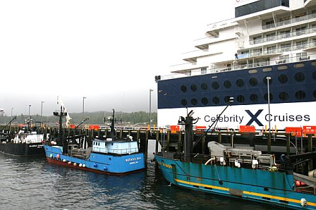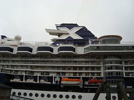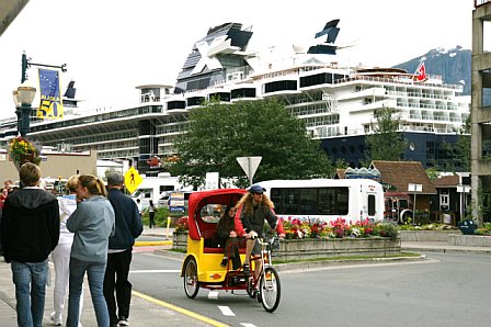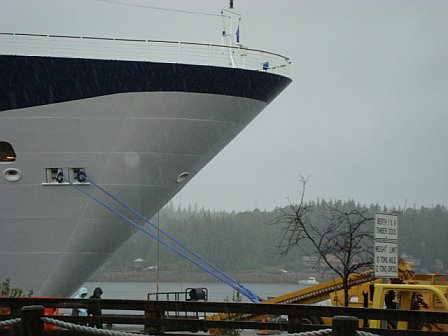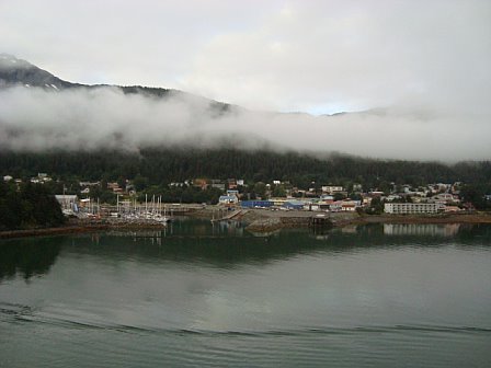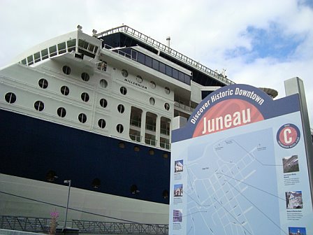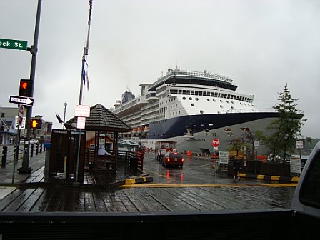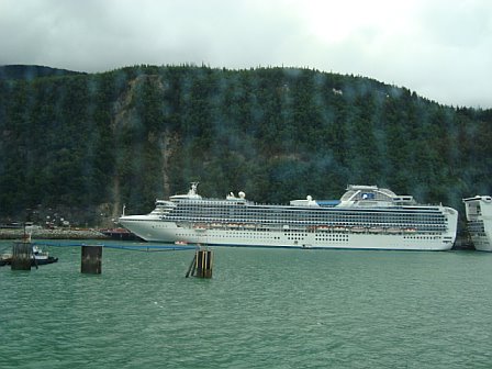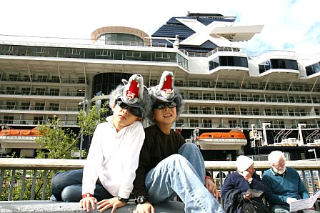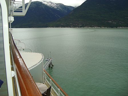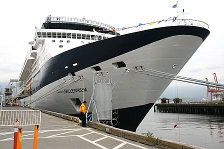 再怎么说,这片位於加拿大西北角临近北冰洋的美国领土,一想到它,脑海里就浮现出一片白茫茫的冰海雪原,朔风凄厉,沉寂广袤的景象;可是又听说那里有着一种自然奇特的美。不管怎么样,我们正在一步步向它走去,一探聖潔神秘的阿拉斯加。 和儿子一家会合,半年不见,惊喜地发现两个宝贝小孙儿,九岁的Dillon和七岁的Mark都长高了,普通话讲得更流利了。以后在船上八天的相处,让我感到他们不可思议的充沛精力,不可低估的聪明智慧,以及敏锐的观察力。 上船时间还早。我们一行七人,悠閒地在一家餐厅享用完午餐之后,就去逛街。这是我们第二次到溫哥華,去年洛矶山脉之旅曾经在此停留过。对这个地方印象深刻,街上绿树成荫、风景如画,气温宜人、空气清新,住宅设计富有特色,漫步在绿意怏然的大街小巷中,心旷神怡、清爽放松,真是一个繁华而自然的环保城市。 我们到达码头时,已是熙熙攘攘、人头攒动,出租车和旅游大巴川流不息,把乘客从四面八方拉到登船的入口处。只见那艘“千禧号”庞然大物停泊在那儿,仿佛在向客人们招唤。我们办理好登记手续,每人领到一张房间钥匙卡,以后在船上的消費,全用這张卡,到最后一晚再結算。还拍照输入电脑,以便确认身份。我们凭着这张卡就登船了。 图2-3 明星千禧号游轮外景1-2