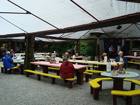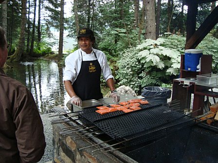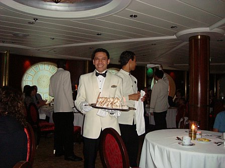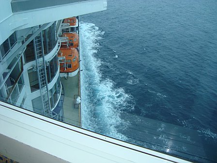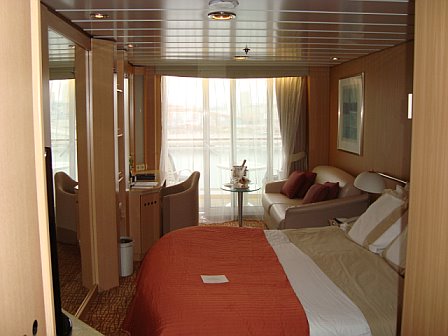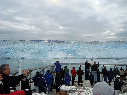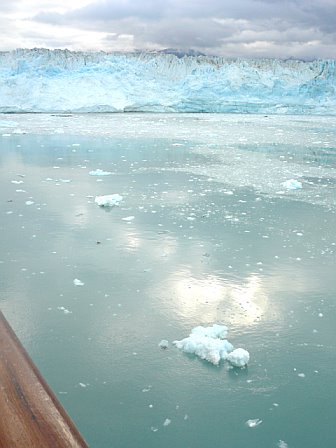 有上次乘“挪威精神号”加勒比海之旅的经验,知道当你上船那一刻开始,就意味着享受天堂一般的生活。游轮带着你远离红尘,把什么凡世俗事、责任、洗衣煮饭等家庭杂务和一切烦恼统统抛在脑后,美食随手可拿,节目丰富多采;晚上在游轮的荡漾和轻鸣声中安然入睡,第二天日出,迎来新景点,新花样。 我们顺利找到了在七层的相邻三间带有露台的房间,室内整洁舒适,沙发、书桌、橱柜、电视、电话、空调、咖啡机、保险箱等一应俱全,还有高质量的床垫;至于可容两人坐下来看海景的迷你露台,尤其让我们满意。那小巧精致的洗手间台面上,一朵鲜艳的红玫瑰仿佛在欢迎新来的客人。大约阿拉斯加的雨天多,壁橱里有备用雨伞,后来真的用上了。这里服务生每天至少进来整理两次,清洁卫生无懈可击,信息资料会及时送达,晚上在铺好的雪白被子上总会放上二颗巧克力,小小的心意带给我们甜蜜的温馨。 图4 我们的居舱