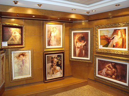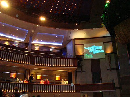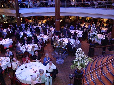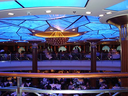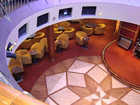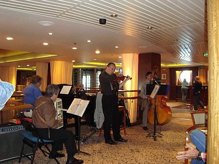 稍事休息,按照要求(以后我们会合都由Dillon或Mark联系)。全体约二千名游客被要求穿戴救生衣,到指定的船舷集合,参加海上遇险演习。置身这个场面,听着尖厉的警报声,望着悬吊头顶的成排救生艇,真是触目惊心,不禁联想起百年前 “泰坦尼克号”的壮烈悲剧。 下午五点四十五分,“千禧号”在汽笛长鸣声中启航了。目送温哥华慢慢远去,一会儿进入了浩瀚無边的大洋。航速渐渐加快。眺望远方,水连天,天连水,苍穹浩瀚,那被游轮的巨型涡轮搅动着的深蓝色海水,泛起朵朵白色浪花,真有乘风破浪的磅礴气势。 接下来,我们前后上下左右闲逛。一行七人,称不上浩浩荡荡,但也是一支小小的队伍了,特别有两个纯真可爱的小男孩在,带来了无比的快乐。他们活泼好动,很快就熟悉了船上的状况;还常常懂事地帮着端水拿面包,为我们服务。 这艘2001年下水的91,000吨超級豪华游轮,宛若海上宫殿,设施讲究,富丽堂皇。游乐消闲设备,酒吧、夜總會、電影院、歌舞剧院、健身房、美容院、游乐室、画廊、商店街、游泳池、球场以及賭場等等应有尽有;在这儿你决不会感到无聊。每过一段时间,负责娱乐的服务人员,还会组织大家玩游戏、比赛等轻松又搞笑的多种活动。我家Dillon在比赛中获得了两项冠军。 图6 酒吧乐队