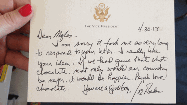 “Dear Myles, I’m sorry it took me so very long to respond to your letter. I really like your idea. If we had guns that shot chocolate, not only would our country be safer, it would be happier. People love chocolate. You are a good boy, Joe Biden.”