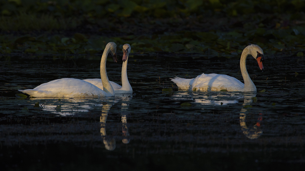昨天早晨在老地方,见到一直跟踪的那家天鹅。虽然只剩下一只小天鹅,但已经长得跟父母差不多大了。上喙的颜色已经发红,但脑门儿上的肉瘤还没有长起来。 P1