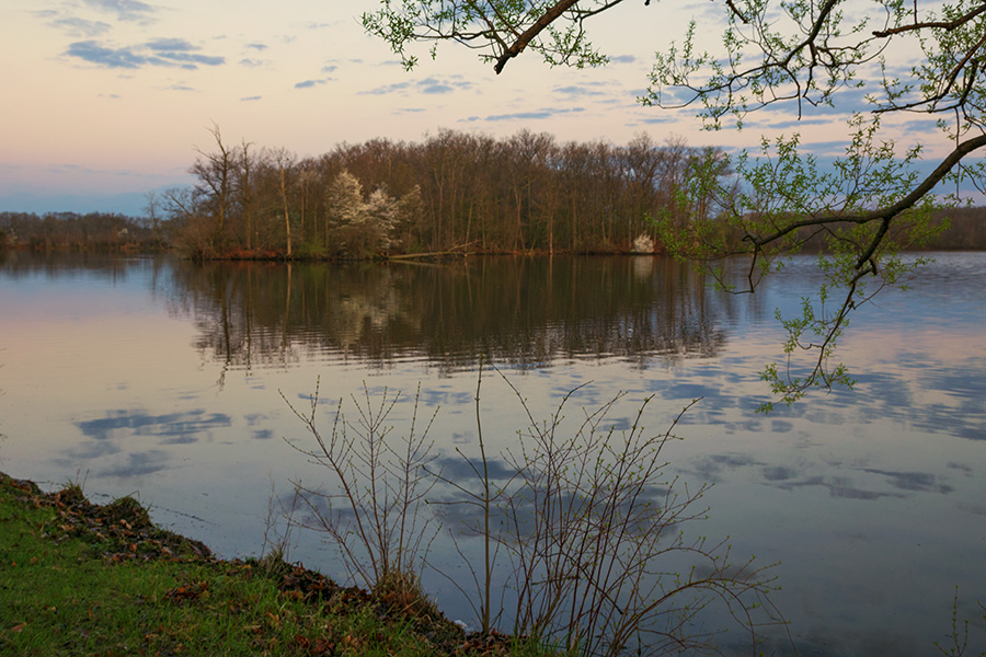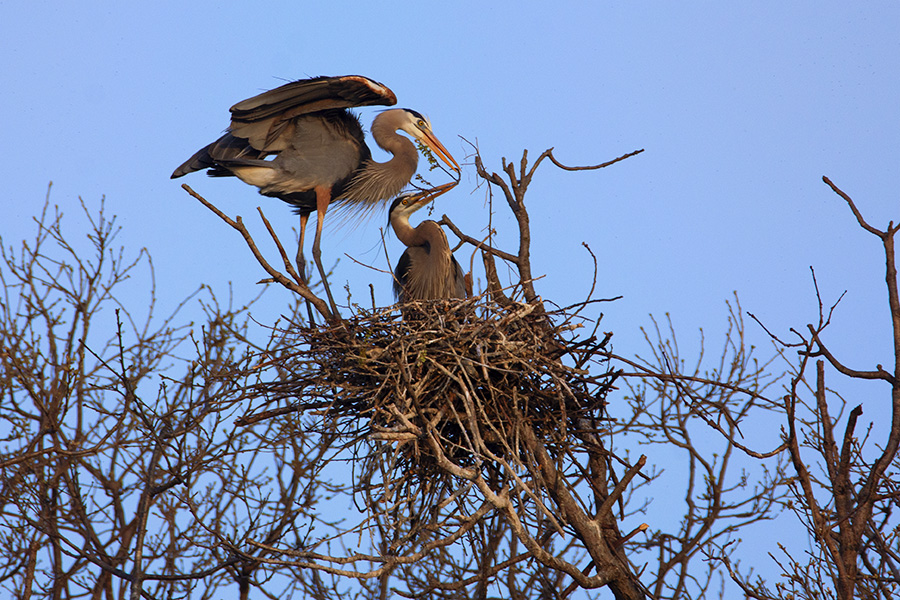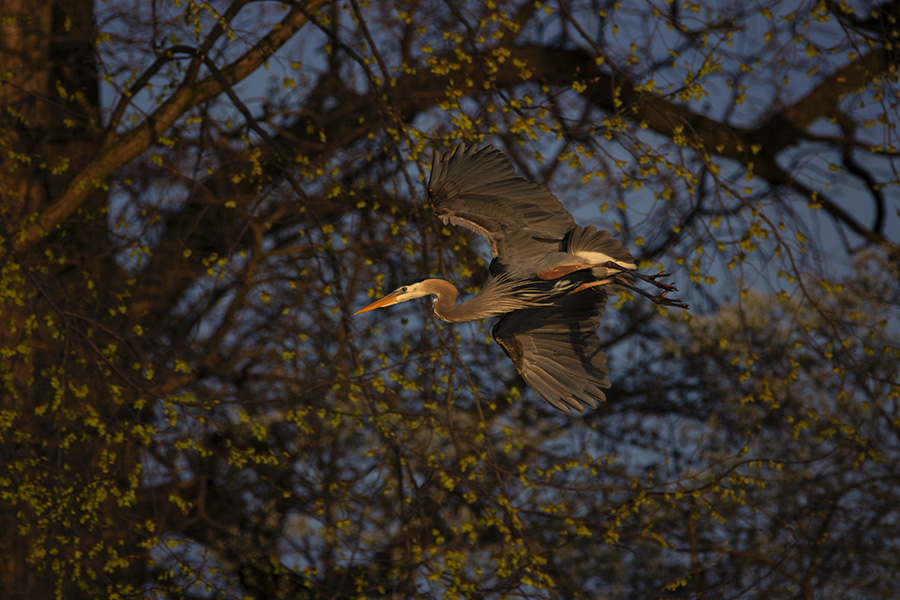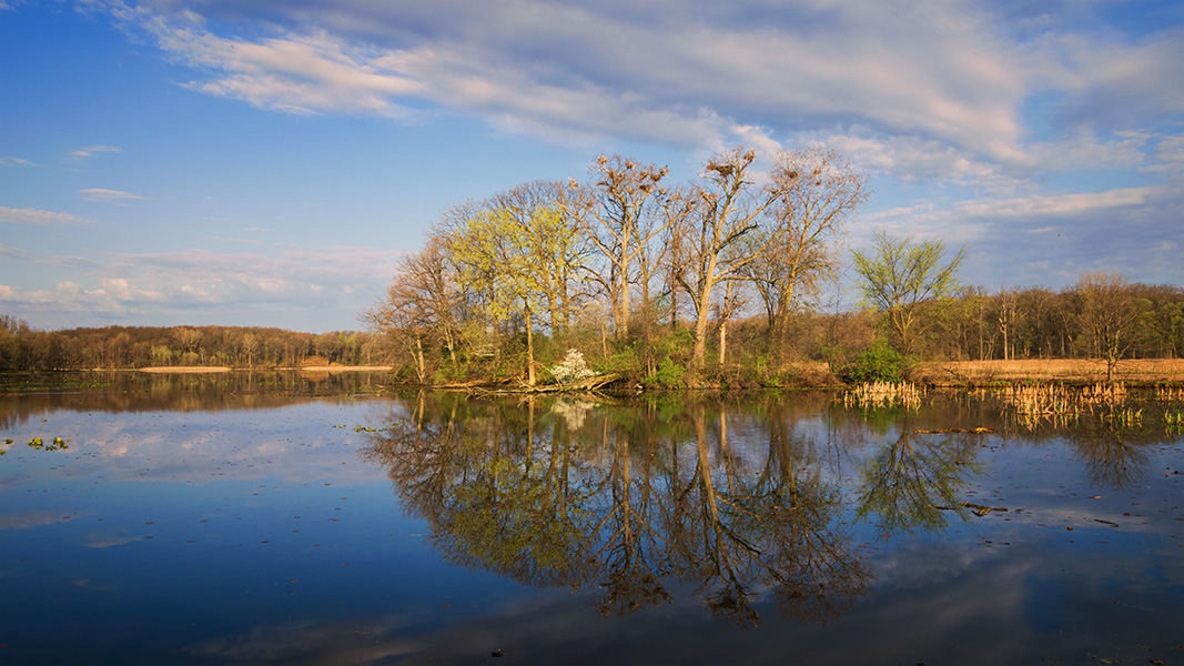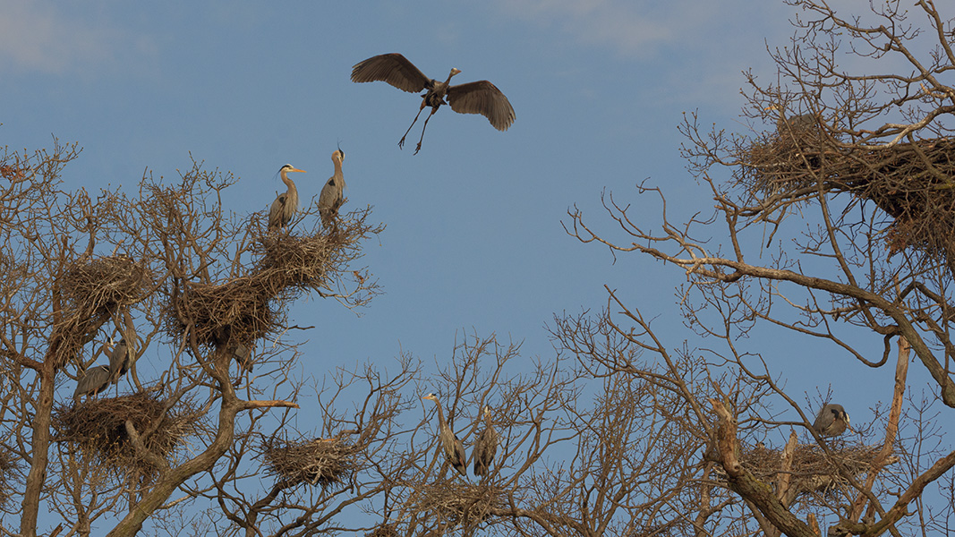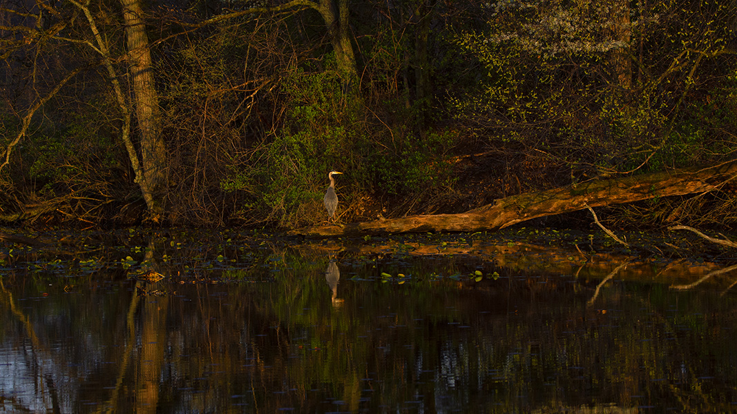 P4. 晨光下的小岛,依稀可见大蓝鹭的窝。
