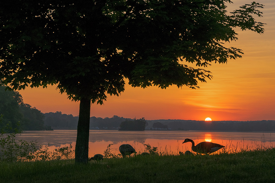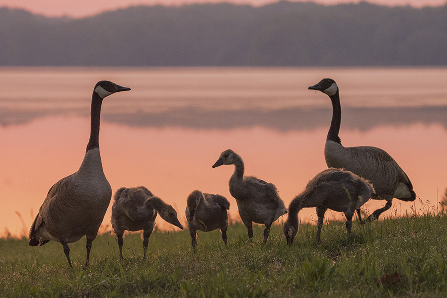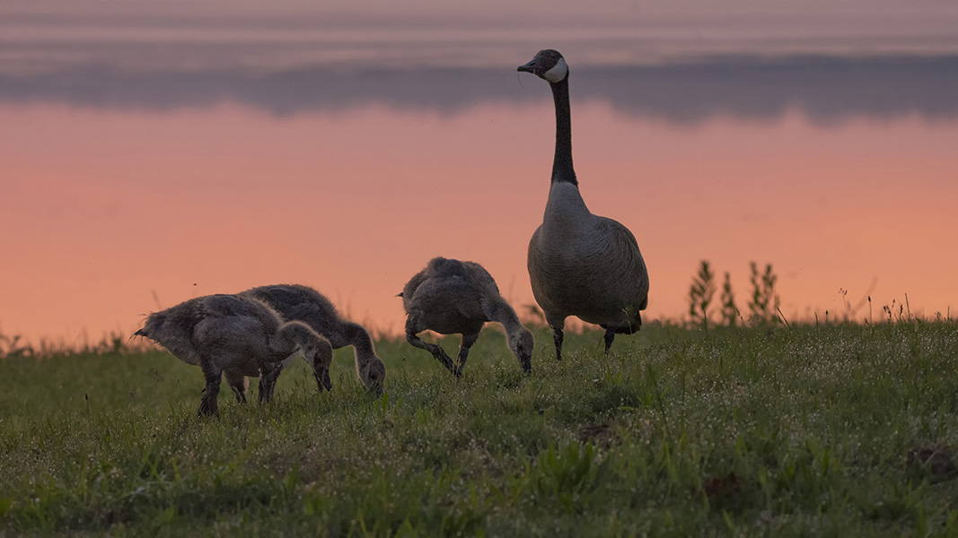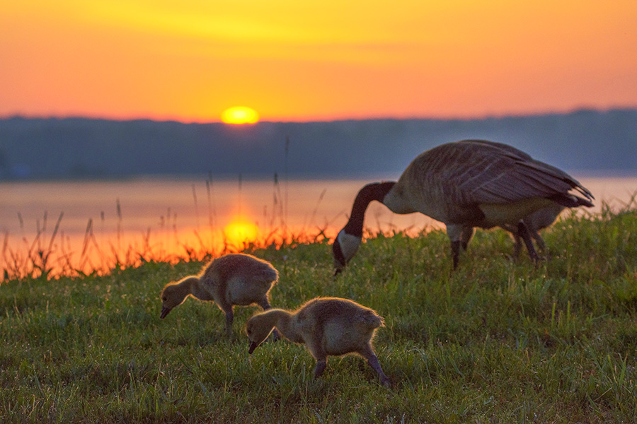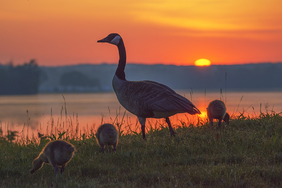 昨天早晨日出前不久来到老地方准备碰碰运气拍白头鹰抓鱼,一下车就看见晨雾中远处湖中小岛的一个枯树枝头老鹰的身影!原以为我的运气不错,哪成想等我拿了三脚架、相机再看,迷雾却越来越浓,老鹰的身影虽然肉眼勉强能分辨出来,但在长焦镜头里已经看不见了... 今天早上再去碰运气。天气十分晴朗,老鹰却没了踪影。我只好守株待兔,架好相机等着老鹰的到来。到了日出的时候,老鹰还是没影,我无意中回头看了一眼,见到旭日初升的瞬间,同时看到一家加拿大雁(鹅?)正处在我和太阳中间!我急忙把相机调转180°在太阳变得耀眼之前抢了几张。 1.