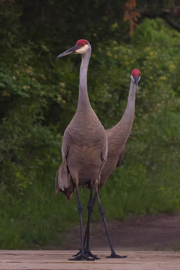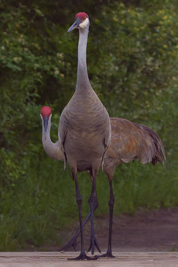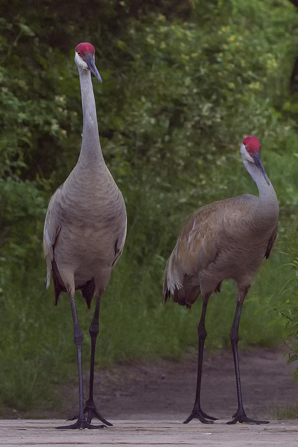 日出以后,天气骤然热了起来,感觉拍老鹰没戏了。我又来到大蓝鹭的巢穴旁,也没戏,大蓝鹭们也都闭门不出。正在沮丧,忽然看到远处一对沙丘鹤在跳舞。我通过长焦看去,原来是几只“红卫兵”(红翅山鹂)在进攻沙丘鹤! 7. 两只沙丘鹤最终被红卫兵赶跑了,和我碰了个对面。那只母的竟然还会“害羞”! 8.