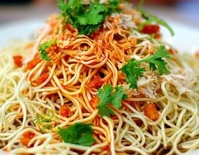 44. 開洋蔥油拌麵——以熬香的蔥油加上燒透的開洋,和麵條一起拌着來吃。地道的開洋蔥油拌麵,麵條有韌勁又滑爽,開洋鮮美,蔥油則是噴噴香。一碗好味道的拌麵在手,桌子上即使有再多的小菜,保證你看也不會看一眼。