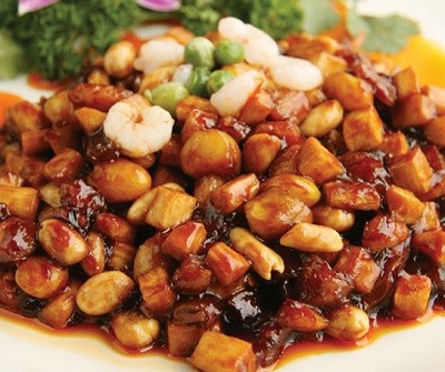36. 八寶辣醬——是上海著名特色菜,它是由“炒辣醬”改良而來的。“炒辣醬”是個普通家常菜,以前在飯攤上供應,由於色深味濃,很適宜下飯。在炒好的辣醬上澆上一個蝦仁“帽子”,又對炒辣醬的原料進行了調整充實,用蝦仁、雞肉、鴨肫、豬腿肉、肚子、開洋、香菇、筍片等八樣主要原料烹製,故稱它為“八寶辣醬”。