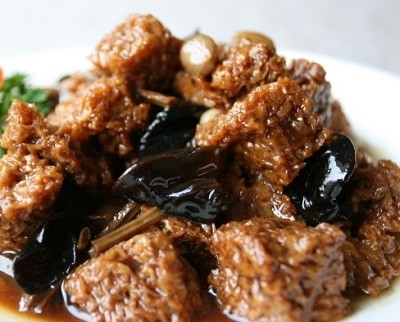 26. 四喜烤麩——烤麩,是一種麵製品。用帶皮的麥子磨成麥麩麵粉,再在水中搓揉篩洗而分離出來的麵筋,經過發酵蒸熟而成的。上海的特色烤麩色醬紅,香濃醇,咸中帶甜。
