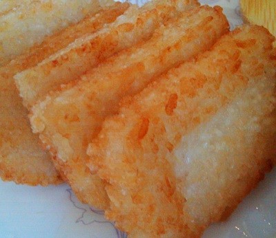 8. 糍飯糕——從前,走到上海的哪條弄堂門口,都會遇見賣糍飯糕的攤子。捧着燙口的糍飯糕,從一條一條的弄堂里穿進走出,吃完一塊糍飯糕,目的地就到了。剛從油鍋里被撩出來的糍飯糕,金黃色的外皮上一個個可愛的油泡爭先恐後地“滋滋”爆破。咬一口,外層是很厚實的香脆,內層是雪白燙口的軟糯糍飯。