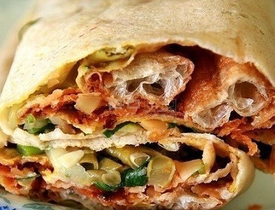 6. 包腳布——所謂“包腳布”,就是雞蛋餅夾油條,裡面再加甜麵醬抑或辣椒醬、適量的榨菜、香菜,包起來象舊時的鉛筆盒一樣,是上海街頭的經典小吃。