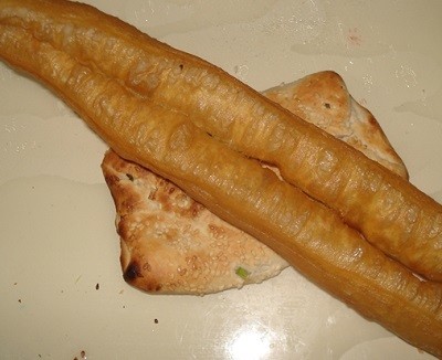 3. 大餅油條——上海四大金剛之一和之二。一根油條一折為二,放在大餅中央;再把大餅對疊,油條就成了餡。小時候,早飯有油條蘸蘸醬油是改善的澆頭。聽父輩們說,如果每天早上都是一副大餅油條,再加一碗淡漿或者是甜漿,那就“資產”得一塌糊塗。每天早飯有“四大金剛”,曾是那時一個小康的理想。
