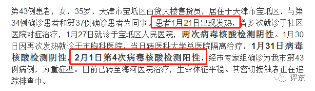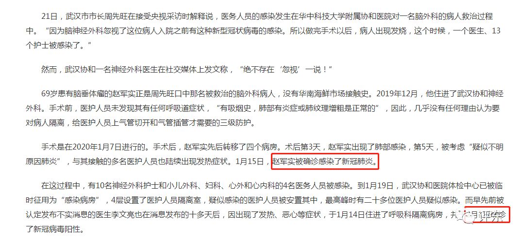 【鱼论】厘清新冠疫情爆发的事实时间线 我们只要事实 拒绝谎言 更憎谣言 谁在撒谎?关于新冠病毒肺炎的一些事实Original 评东 / 评东 Today 最近网上有几个大靶子,从湖北武汉红十字会,武汉市政府到武汉病毒所和CDC,质疑的声浪此起彼伏,理性的声音几乎稀释到消失。前篇说到,事物从来不是非此即彼,要批评一个事物我们首先要了解事物本身。如果不了解事物本身,仅仅因为媒体或社交平台上零碎而无法验证的信息片段就建立起对某一个事物的想象和立场,也许这是公民的言论自由,但有时候也是一种无知和傲慢。 诚然,新闻媒体和群众舆论监督是一种广泛的监督方式,应该给予一定的宽容和理解,但是俗话说——隔行如何山,媒体和群众监督必然存在专业性不足的问题,客观求证的难度和发表立场的随意性决定了舆论声音不可避免的主观性、情绪性和非理性。批评本身没有任何价值,只有解决问题才会产生价值。有建设性的批评能促进问题的解决,盲目的抨击只会扰乱社会原有的秩序。社交媒体时代的人类最缺乏的可能是对于专业问题的自知之明吧。 作为一个喜欢评论时政的生物狗,我承认,自知之明什么的我没有那种东西啦。为了深刻检讨和反思,今天就聊聊新型冠状病毒吧—— 一、协和医院14位医护人员感染问题争议 先看简要报道: 1、1月15日,武汉市卫健委官网发布的《新型冠状病毒感染的肺炎疫情知识问答》指出,现有的调查结果表明,尚未发现明确的人传人证据,不能排除有限人传人的可能,但持续人传人的风险较低。 2、1月20日,钟南山在央视采访中肯定了新型冠状病毒存在人传人的现象。 网民愤怒了。不是说没有人传人吗?才过几天就传人了? 由于14名神经外科医生被感染的事件是在1月7日进行的手术,相关情况在1月21日才被新闻媒体公开报道,舆论普遍认为是钟南山打破政府系统的瞒报才逼出来的。 这里我们先看看决定这个事件是非的关键,14名医护人员被传染的事件原文: 重点来了,作为传染源的接受神经外科手术患者赵军确诊的时间是1月14日。也就是说在1月14日之前并没有任何人知道个别医护人员出现发热咳嗽症状的来源有可能是一次神经外科手术的暴露,他们甚至有人不会关注到自己身体不适。 手术时间是1月7日,按照2-14天潜伏期,医护人员因为这次暴露而感染后出现症状的时间在是1月9日-21日的范围内,而本次新型冠状病毒的轻症占80%,20%的重症中大多在第二周病情开始加重出现呼吸困难等症状,那么,医护人员出现症状是普通感冒还是疑似“新型冠状病毒”感染的临床差异出现的时间大约是1月16日-1月28日之间。 这里再补充一个非常重要的信息:“天津市新增4例新冠肺炎确诊病例,一患者前三次检测呈阴性” 这说明哪怕是出现发热症状之后病毒核酸检测还可能是阴性的,更何况是潜伏期,感染后只有病毒在体内扩散和复制到一定程度,取样的病毒核酸浓度才足以检测出,这是病毒本身特性的问题还是检测技术灵敏性的问题我不好下结论,但是说明一个重点,感染病毒之后到能够被病毒核酸检测确诊是需要一段时间的。从天津的个案来看,以潜伏期3天计算这个时间也足有14天,实际时间最长甚至可能有25天。 由于在1月14日赵军才确诊为新型冠状病毒肺炎患者,因此开始怀疑1月10日后个别出现发热、咳嗽的医护人员有可能感染了新型冠状病毒,但是在1月16日之前医护人员不会有临床上的疑似冠状病毒肺炎的明确特异性症状出现,没有任何证据指向医护人员被传染了新型冠状病毒,第一个医护人员确诊的时间在什么时候相关报道并没有明确,推测最早应该在1月19日之后,即报道中医院因出现多个医护人员存在相似症状,疑似感染新型冠状病毒肺炎,因此征用体检中心作为隔离病房的时间,我们可以反过来想,如果1月19日之前,14位医护人员中有任何一位检测确诊了,协和医院一定会在第一时间采取14人全部隔离的措施。因此真相只有一种可能,直到1月19日隔离之前,14位医护人员根本没有任何一位确诊。后续有明确报道该医院有医护人员经检测确诊的时间是2月1日,这个时间没有什么讨论的价值。 我们重新梳理一下时间线: 1、1月7日患者赵军在神经外科做肺插管手术,14名医护人员受感染; 2、1月9日-14日协和医院先后有多位医护人员出现发热、咳嗽等症状,但因3、无相关接触史,并未与新型冠状病毒肺炎相关联; 4、1月14日因为患者赵军被确诊为新型冠状病毒肺炎,但因新型肺炎暂无人传人案例,个别医护人员也无法排除接触其他患者感染新型冠状病毒肺炎或者其他流感的可能性。因此无法确定个别医护人发热、咳嗽的原因,但怀疑可能存在人传人。 因此,1月15日武汉发布尚未发现明确的人传人证据,不能排除有限人传人的可能。 5、1月15日-1月19日大数参与赵军手术的医护人员均出现类似症状,虽然还没有直接确诊的证据,但从临床经验上判断,极有可能是新型冠状病毒肺炎发生传人,因此钟南山赶赴武汉,医院采取了临时隔离的措施。但依然无法明确是“有限人传人”还是“持续人传人”。 6、1月20日钟南山公开了新型冠状病毒存在人传人的现象。(并未明确是有限人传人还是持续人传人) 结论:无论是周先旺代表武汉市的发布,还是钟南山代表疾控中心的发布,实际上都是前一天刚得到的最新消息,甚至可能是为了万全考虑的前瞻判断,根本不存