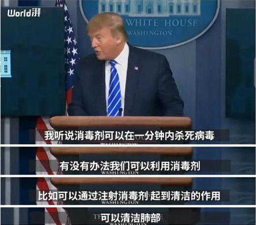 4月23日,特朗普總統在白宮疫情發布會上提出了一個令人瞠目結舌的新冠肺炎治療方案,即給患者注射消毒劑並用紫外線光照射人體,還要求美國土安全部副部長布萊恩找一些醫生來參與此項計劃。這番言論立即引發全世界軒然大波。一大批醫學專家發出警告說,用消毒劑作為新冠肺炎的治療方法極其危險,可能導致死亡,是不負責任的建議。世界知名的消毒劑Lysol和滴露的生產商英國利潔時公司警告:“在任何情況下,我們的消毒產品都不能透過注射、食用或其它途徑進入體內”。美國國家環境保護局也提醒人們,“決不能將消毒產品使用在你自己或其他人身上。不要吞食消毒產品”。
