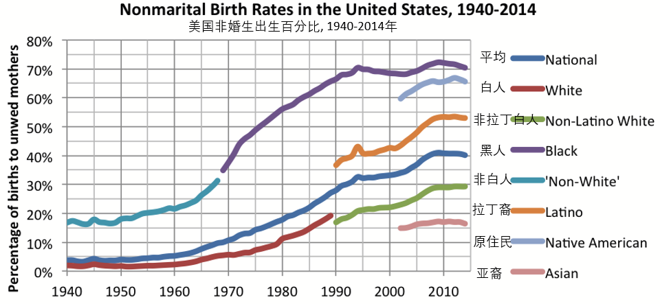 上面的圖表顯示,1960年代末,黑人婚外生育率約35%。過去二十多年,黑人婚外生育率,一直在70%以上。