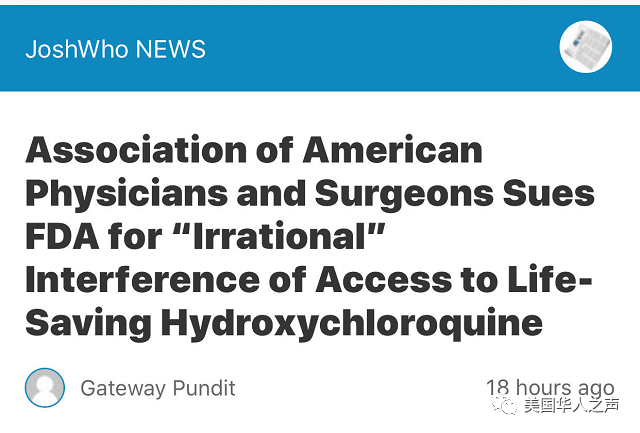 昨天,JoshWho 新聞曝光了主流媒體全體沉默的一個重磅消息,美囯內科與外科醫生協會AAPS於6月2日在密歇根州地方法院,對美國FDA進行法律訴訟:以“不合理”的方式阻撓對拯救生命羥氯喹的應用。