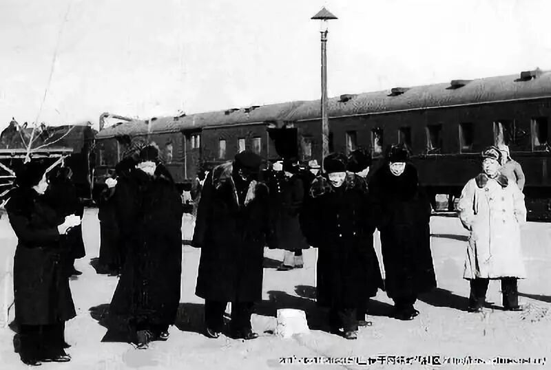 1950年2月,毛澤東結束訪蘇回國途經海拉爾車站下車散步,左起孫維世、毛澤東、高崗、歐陽欽、葉子龍、周恩來、滕代遠