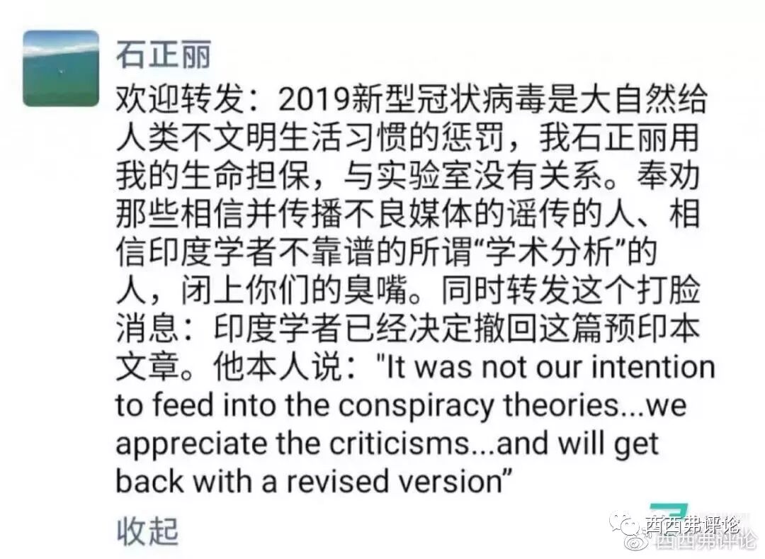 一個團隊花了十幾年研究一個課題。應該是有點軸認死理的人。我看到那個朋友圈,我能從心裡感受到石研究員心中的憤怒和冤屈。花了十幾年時間研究SARS的來源,新冠發生後,全力以赴做基因測序,然後在武漢全城封城的環境下,不眠不休開始研發疫苗,然後輿論用如此惡毒的陰謀論攻擊她和她的團隊。我現在最大的希望就是石研究員不要鑽牛角尖,別真的動什麼用生命擔保的念頭。