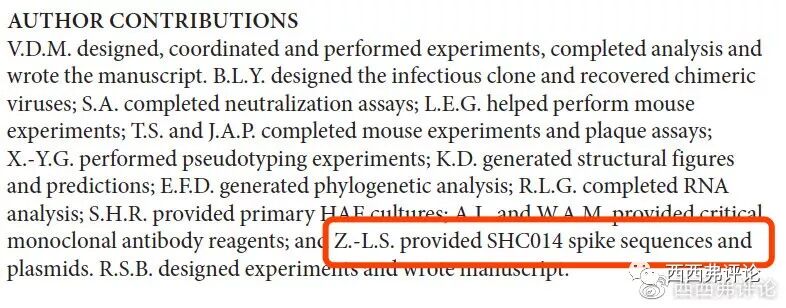 石正麗提供了SHC014 的 spike sequences and plasmids。SHC014就是從中華菊頭蝠裡面找到的那個類SARS病毒,是SARS溯源研究證明SARS來源於蝙蝠的最有利的證據。spike sequences and plasmids,兩個詞完全不懂,Google了一下,大概一個是類似於基因序列的東西,另一個應該是病毒的樣本吧。