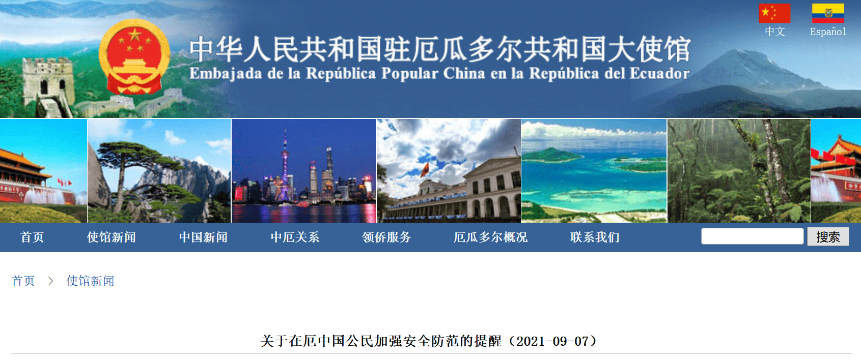 9月7日,中國駐厄瓜多爾大使館網站發布關於在厄中國公民加強安全防範的提醒,以下為全文: