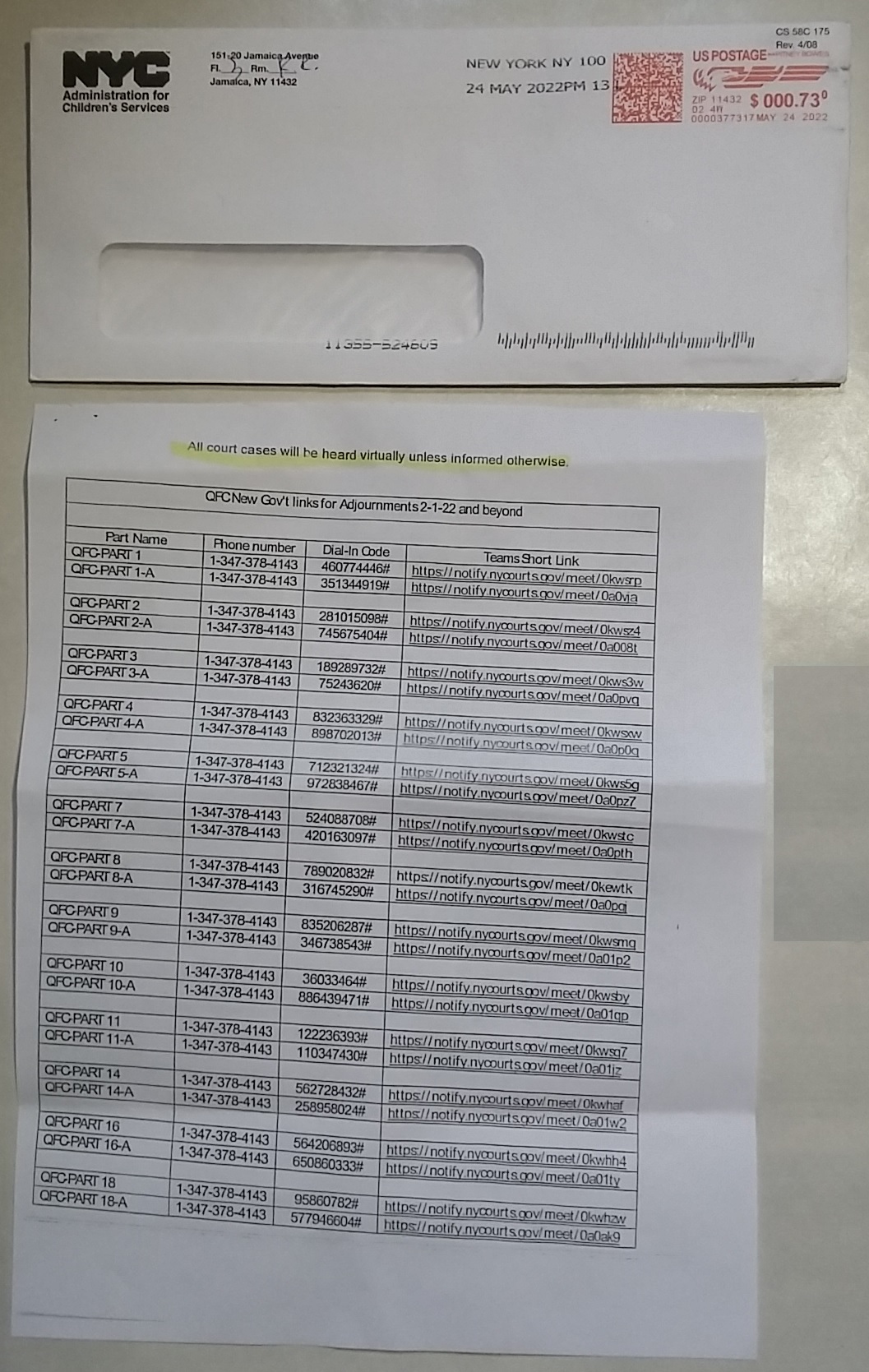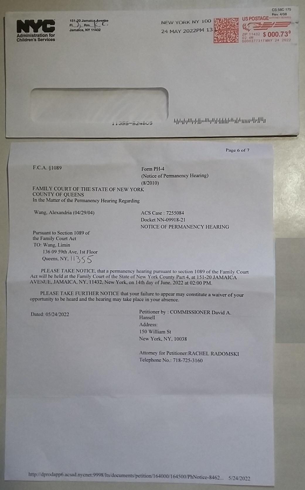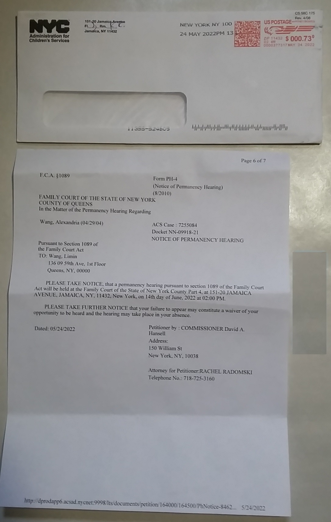 The NYC ACS mail had only three pages inside, NO SIGNATURE ON ANY PAGE. The first two pages were practically identical other than on one page the zip code of “00000” of my rental residence address had been whitened and a “11355” was HANDWRITTEN over. This happened EVEN AFTER EIGHT MONTHS INTO THE ACS’S OWN FABRICATED “CHILD NEGLECT” CASE NN-09918-21! Although the two pages have prints of “Page 6 of 7” on the upper right corner, there are ABSOLUTELY NO OTHER SIX PAGES in the mail! Also, the NYC ACS humanscums started to only address to ME, INSTEAD of BOTH PARENTS, i.e., including the mother Li Li. The NYC ACS humanscums sent TWO of such “page 6 of 7” within the same envelope, BOTH addressing ONLY to me Limin Wang, but have NOT sent Li Li the notice of the BOGUS “hearing” YET, and the “Family Court” has NOT sent out the NOTICE to either parent YET, although the bogus “hearing” is supposed to start within in hours! This postal mail’s “page 6 of 7” clearly states the “hearing” time starts at 2:00 PM of June 14, 2022, and indicates it’s an IN-PERSON ON-COURT “real” “serious” “hearing” about the “PERMANENCY”, but the SEPARATE third page clearly states and highlights, “All court cases will be heard virtually unless informed otherwise.” Then, what’s more deliberately confusing is the “attorney” for NYC ACS, “Rachel Radomski”, sent out EMAIL to the Queens Family Court and me on May 31, 2022 and stated the purpose of the June 14, 2022 “hearing” is again and still for “FF” (note: their intimidating legal jargon of “FACT FINDING”), and the time is now written to be 3:00 – 3:45 PM, and the availability of a unspecified crap as a “witness” from Bronx High School of Science is NOT available by the difference of ONE FULL HOUR. In other words, the BHSS crap would not even be available as a “witness” OVER THE PHONE in the “virtual hearing”. The court attorney “Jane Shortell” replied the email simply as “That day is booked all day.” How busy the “Family Court” is in systematic children trafficking and family destroying? What time and content would be included in the “NYCourts.gov” system as the “record”? Why the AES HUMANSCUMS would not fabricate “record” of the parent(s) NOT PRESENT at the 2:00 PM “hearing” time? The AES HUMANSCUMS have NEVER sent the “legal proceeding” “materials” to the 18-yr-old Alexandria Wang, and have NEVER brought AW to any of the “court” “virtual hearings” although they PHYSICALLY AND PSYCHOLOGICALLY CONTROL ALEXANDRIA WANG TOTALLY AND COMPLETELY. Based on this kind of “work quality” and “human integrity”, what the AES HUMANSCUMS can provide to the parents and the child? The AES Humanscums had oppressed, drugged and brainwashed Li Li into a “PSYCHOTIC” DYSFUNCTIONAL state staying full-time at home, but they have kept covertly and overtly wanting to frame Li Li into the victim role of “DOMESTIC VIOLENCE ONLY”!