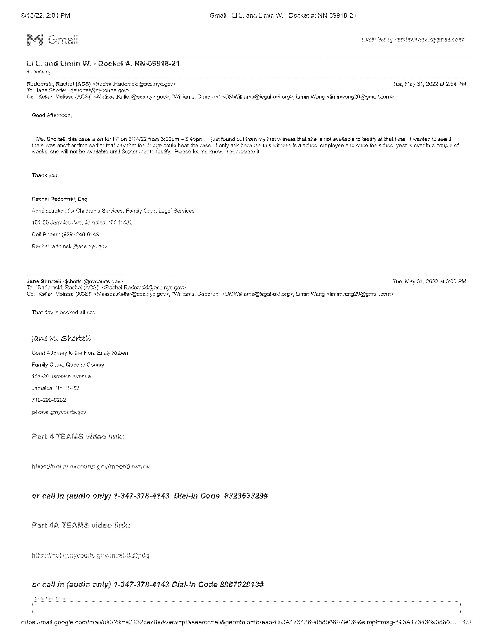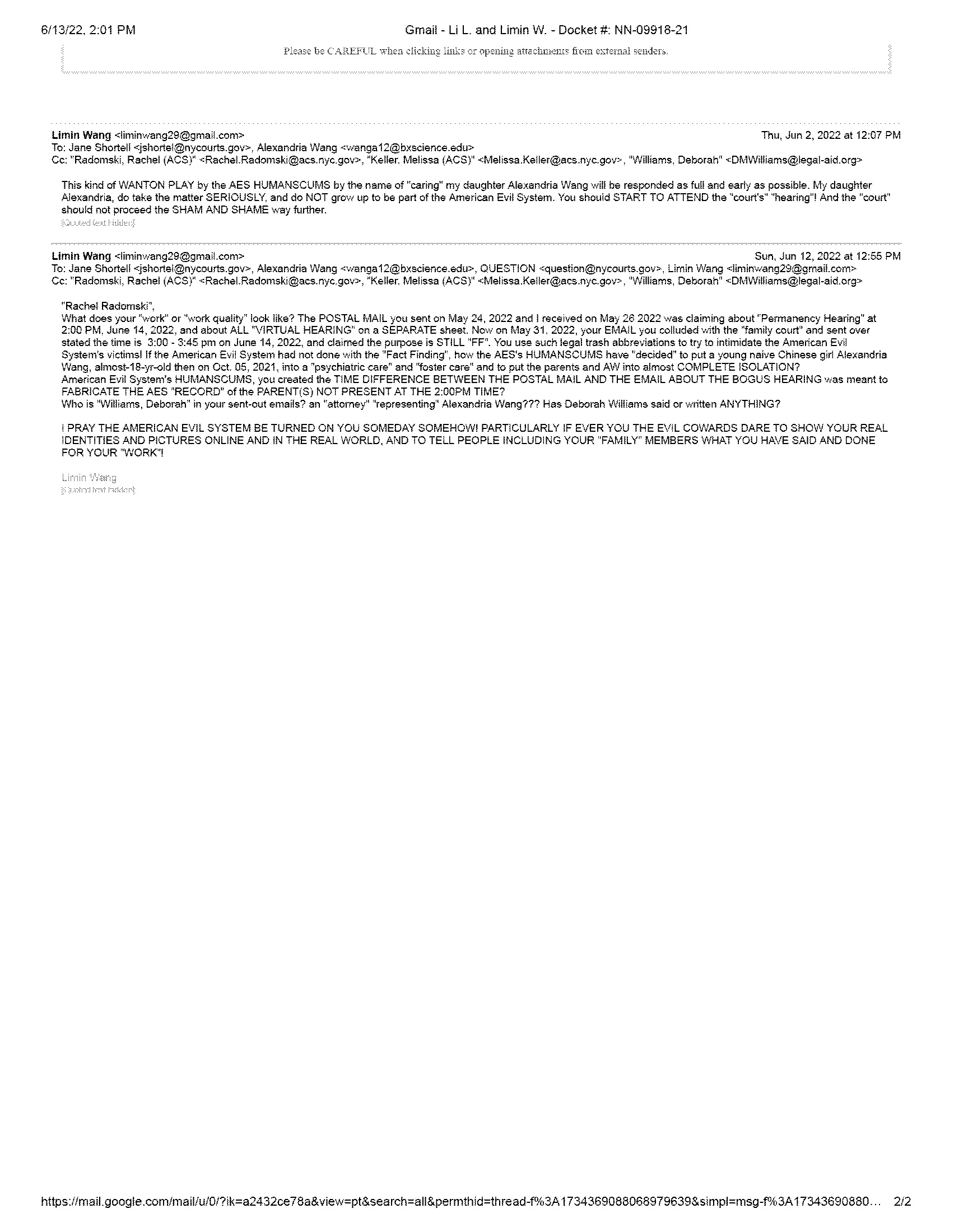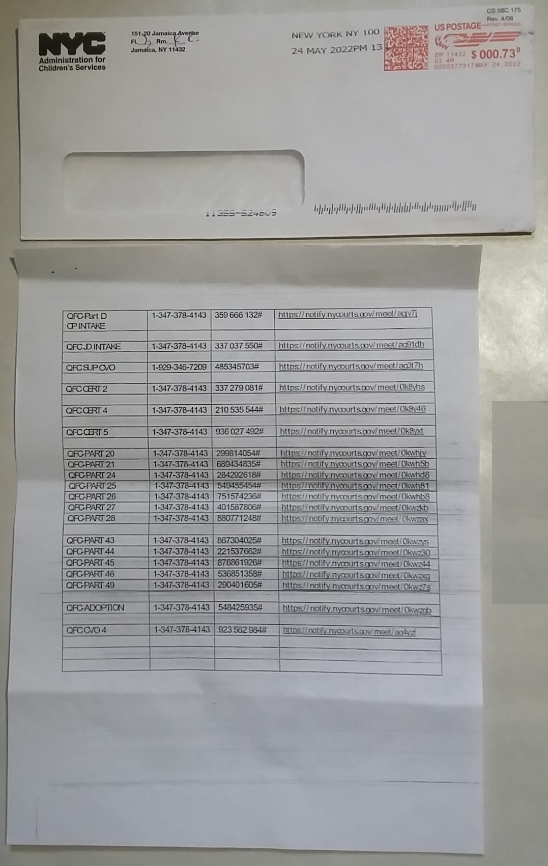 The NYC ACS mail had only three pages inside, NO SIGNATURE ON ANY PAGE. The first two pages were practically identical other than on one page the zip code of “00000” of my rental residence address had been whitened and a “11355” was HANDWRITTEN over. This happened EVEN AFTER EIGHT MONTHS INTO THE ACS’S OWN FABRICATED “CHILD NEGLECT” CASE NN-09918-21! Although the two pages have prints of “Page 6 of 7” on the upper right corner, there are ABSOLUTELY NO OTHER SIX PAGES in the mail! Also, the NYC ACS humanscums started to only address to ME, INSTEAD of BOTH PARENTS, i.e., including the mother Li Li. The NYC ACS humanscums sent TWO of such “page 6 of 7” within the same envelope, BOTH addressing ONLY to me Limin Wang, but have NOT sent Li Li the notice of the BOGUS “hearing” YET, and the “Family Court” has NOT sent out the NOTICE to either parent YET, although the bogus “hearing” is supposed to start within in hours! This postal mail’s “page 6 of 7” clearly states the “hearing” time starts at 2:00 PM of June 14, 2022, and indicates it’s an IN-PERSON ON-COURT “real” “serious” “hearing” about the “PERMANENCY”, but the SEPARATE third page clearly states and highlights, “All court cases will be heard virtually unless informed otherwise.” Then, what’s more deliberately confusing is the “attorney” for NYC ACS, “Rachel Radomski”, sent out EMAIL to the Queens Family Court and me on May 31, 2022 and stated the purpose of the June 14, 2022 “hearing” is again and still for “FF” (note: their intimidating legal jargon of “FACT FINDING”), and the time is now written to be 3:00 – 3:45 PM, and the availability of a unspecified crap as a “witness” from Bronx High School of Science is NOT available by the difference of ONE FULL HOUR. In other words, the BHSS crap would not even be available as a “witness” OVER THE PHONE in the “virtual hearing”. The court attorney “Jane Shortell” replied the email simply as “That day is booked all day.” How busy the “Family Court” is in systematic children trafficking and family destroying? What time and content would be included in the “NYCourts.gov” system as the “record”? Why the AES HUMANSCUMS would not fabricate “record” of the parent(s) NOT PRESENT at the 2:00 PM “hearing” time? The AES HUMANSCUMS have NEVER sent the “legal proceeding” “materials” to the 18-yr-old Alexandria Wang, and have NEVER brought AW to any of the “court” “virtual hearings” although they PHYSICALLY AND PSYCHOLOGICALLY CONTROL ALEXANDRIA WANG TOTALLY AND COMPLETELY. Based on this kind of “work quality” and “human integrity”, what the AES HUMANSCUMS can provide to the parents and the child? The AES Humanscums had oppressed, drugged and brainwashed Li Li into a “PSYCHOTIC” DYSFUNCTIONAL state staying full-time at home, but they have kept covertly and overtly wanting to frame Li Li into the victim role of “DOMESTIC VIOLENCE ONLY”!