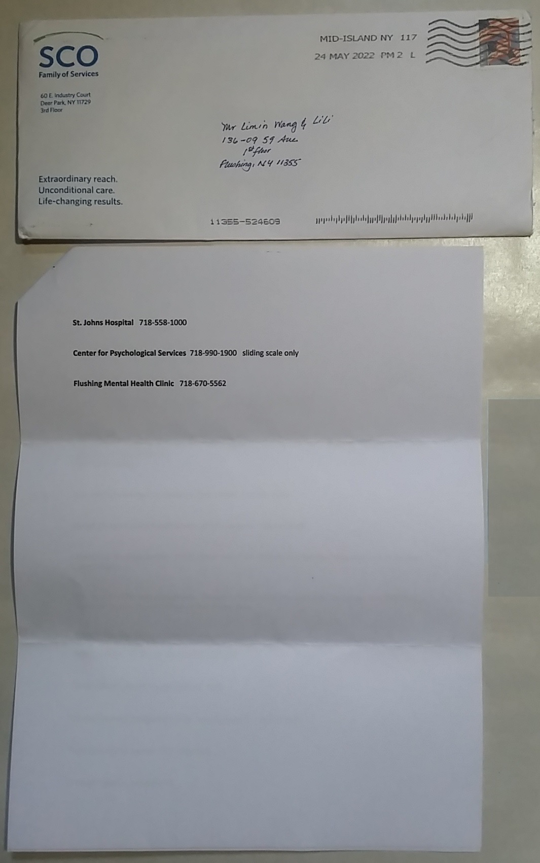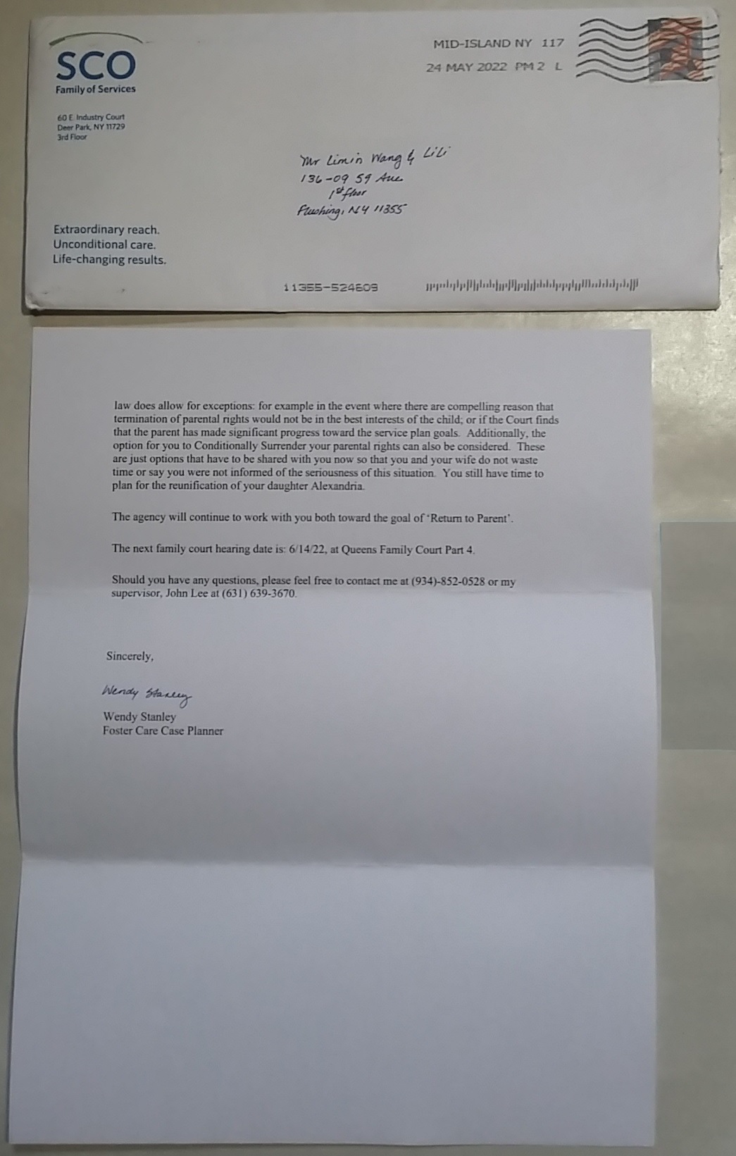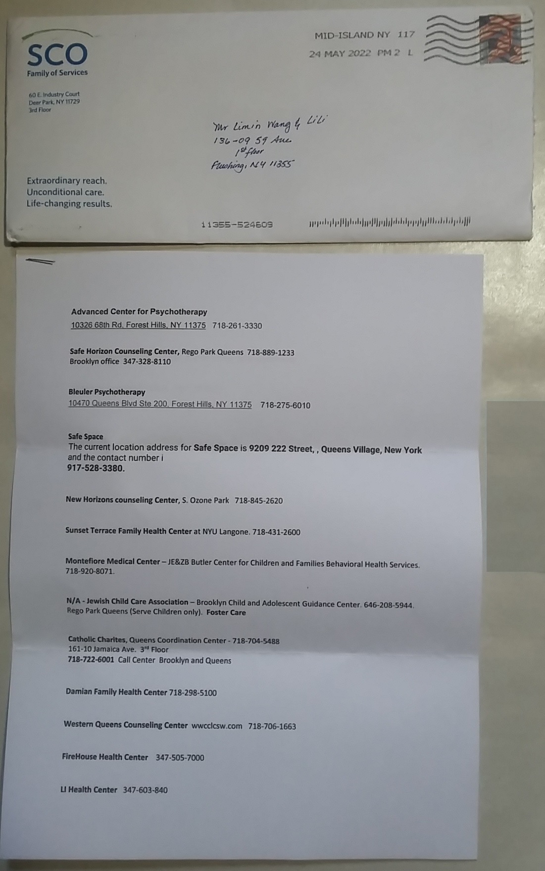 On May 26, 2022, Thursday, I received three postal mails, respectively sent from NYC ACS, SCO Family of Services, and Molina Healthcare. All the envelopes and the contents are shown as attached images to this article.