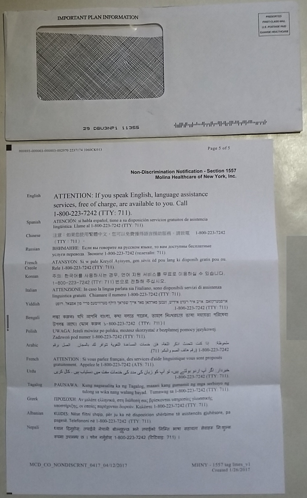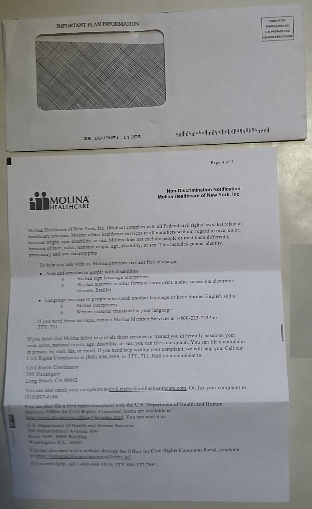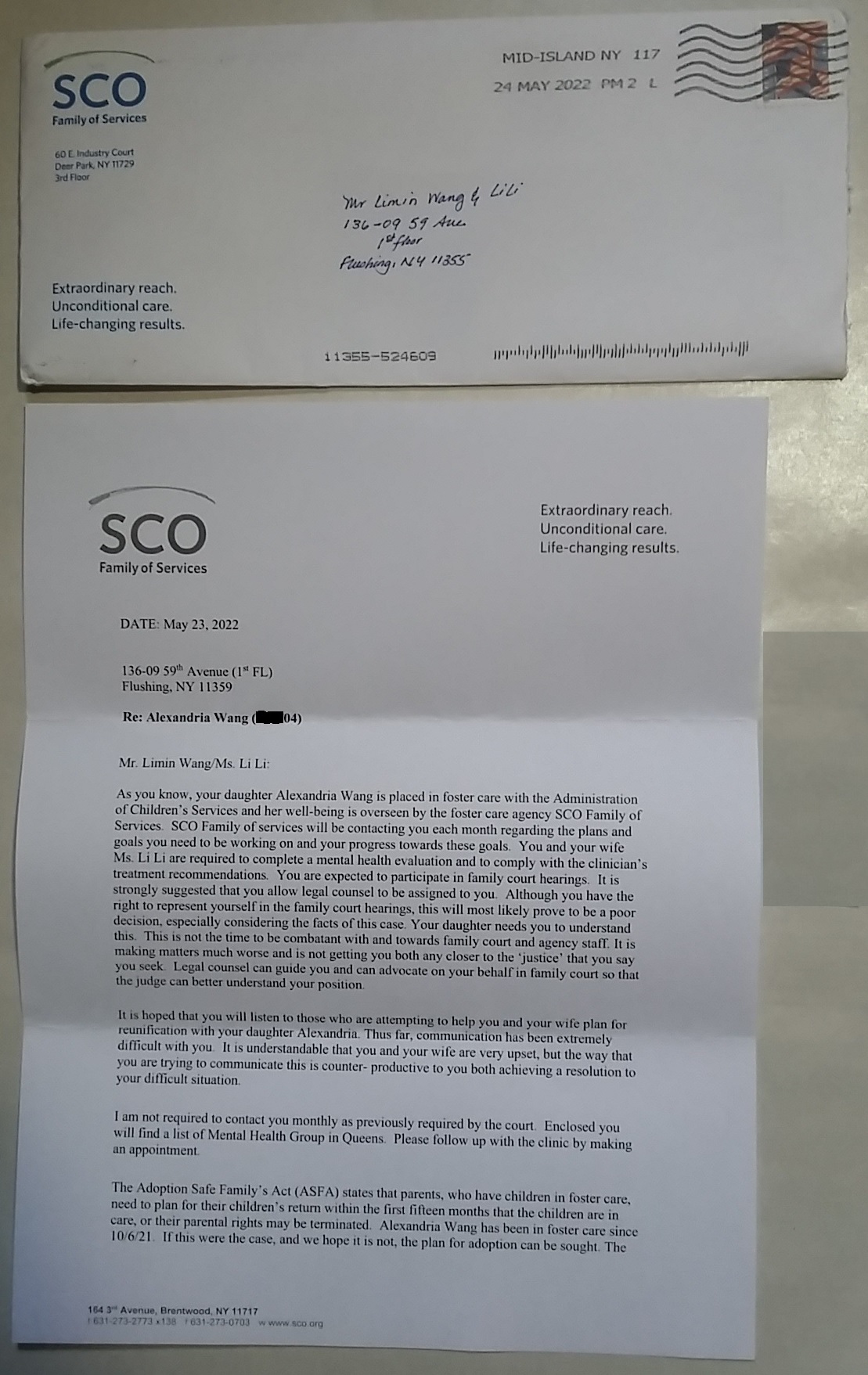On May 26, 2022, Thursday, I received three postal mails, respectively sent from NYC ACS, SCO Family of Services, and Molina Healthcare. All the envelopes and the contents are shown as attached images to this article.