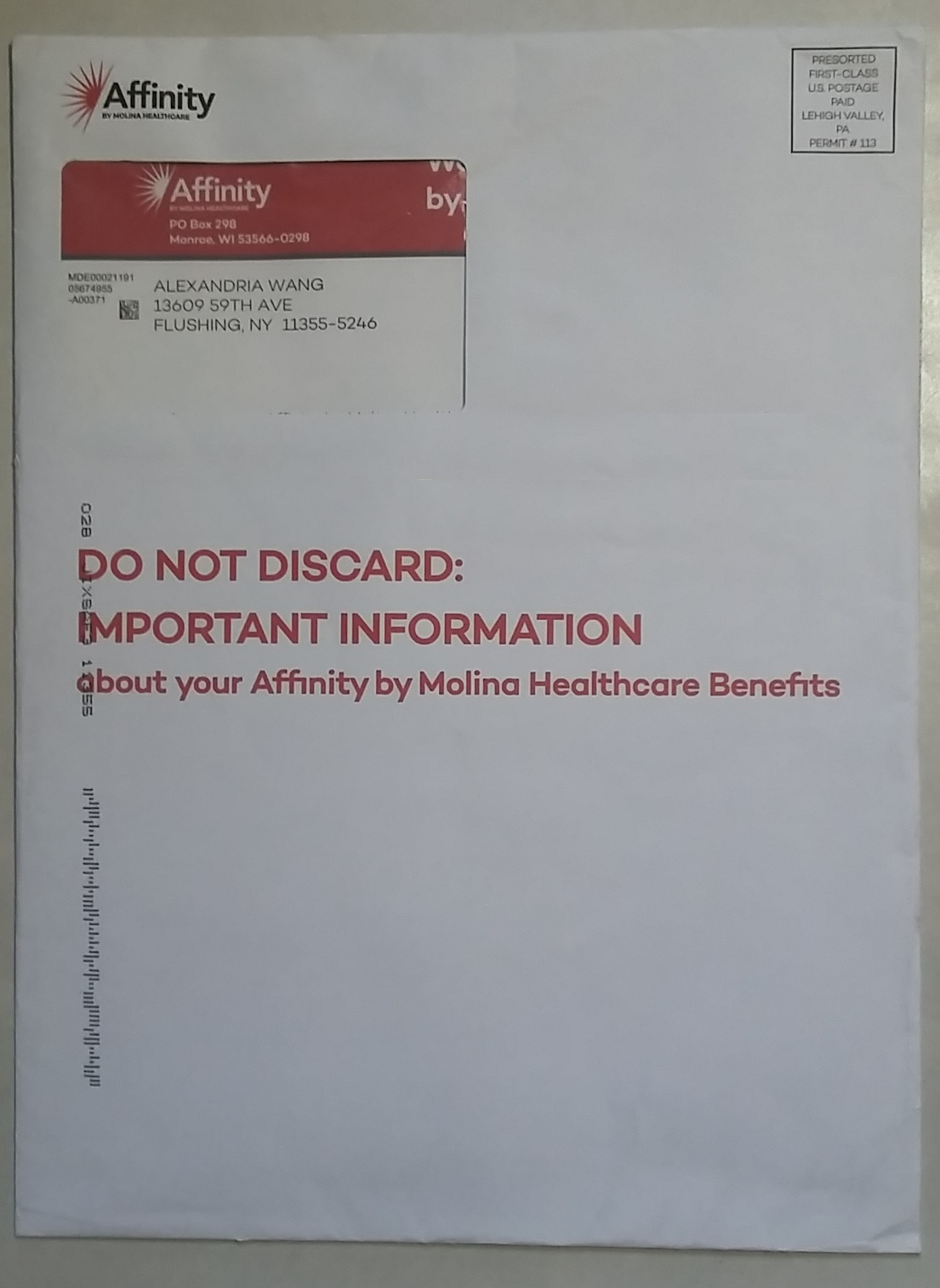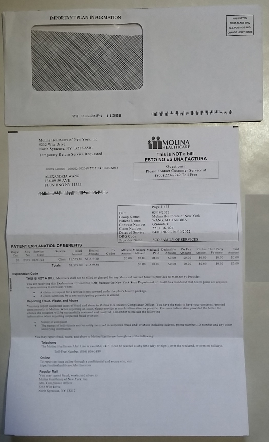 Since mid-February of 2022, mails of different sizes seemingly from all over the continental U.S.A. have flooded from Molina Healthcare to “Alexandria Wang” at the parents’ rental address. Such mails show the charges, and total denial of paying the NEVER SPECIFIED “MEDICAL SERVICE” TO NEVER SPECIFIED “MEDICAL PROVIDERS”, and then multiple pages of how to contact them and to resolve issues. Alexandria Wang has been de facto abducted by the AES HUMANSCUMS into a UNSPECIFIED location, so of course she was not living here any more, and the occasional text-messages seemingly from AW herself are insinuating her “NO RETURN”. Then, why such mails have not been sent really to Alexandria Wang at her real address?