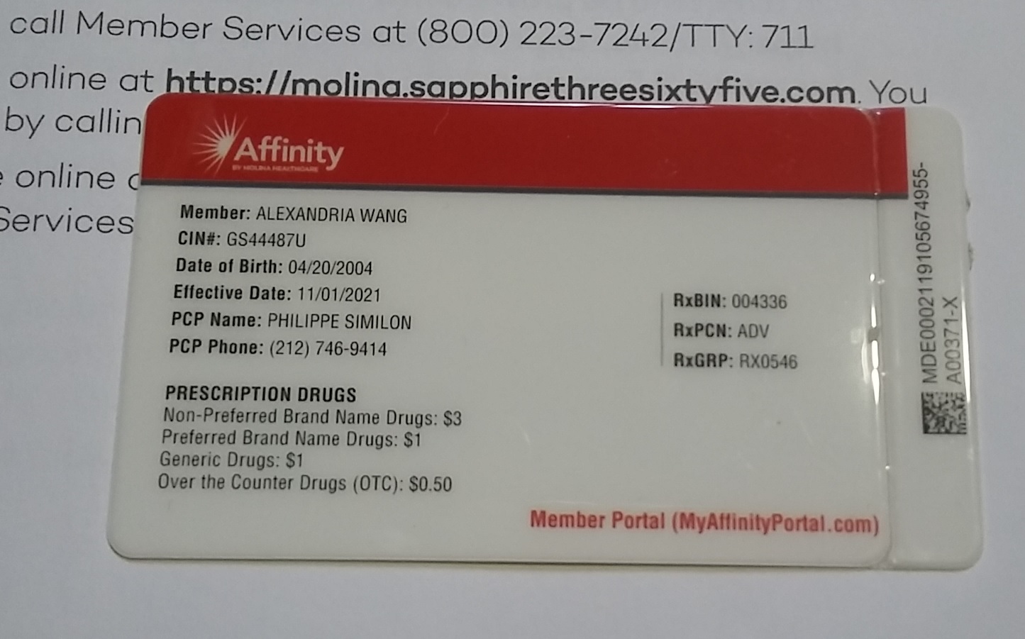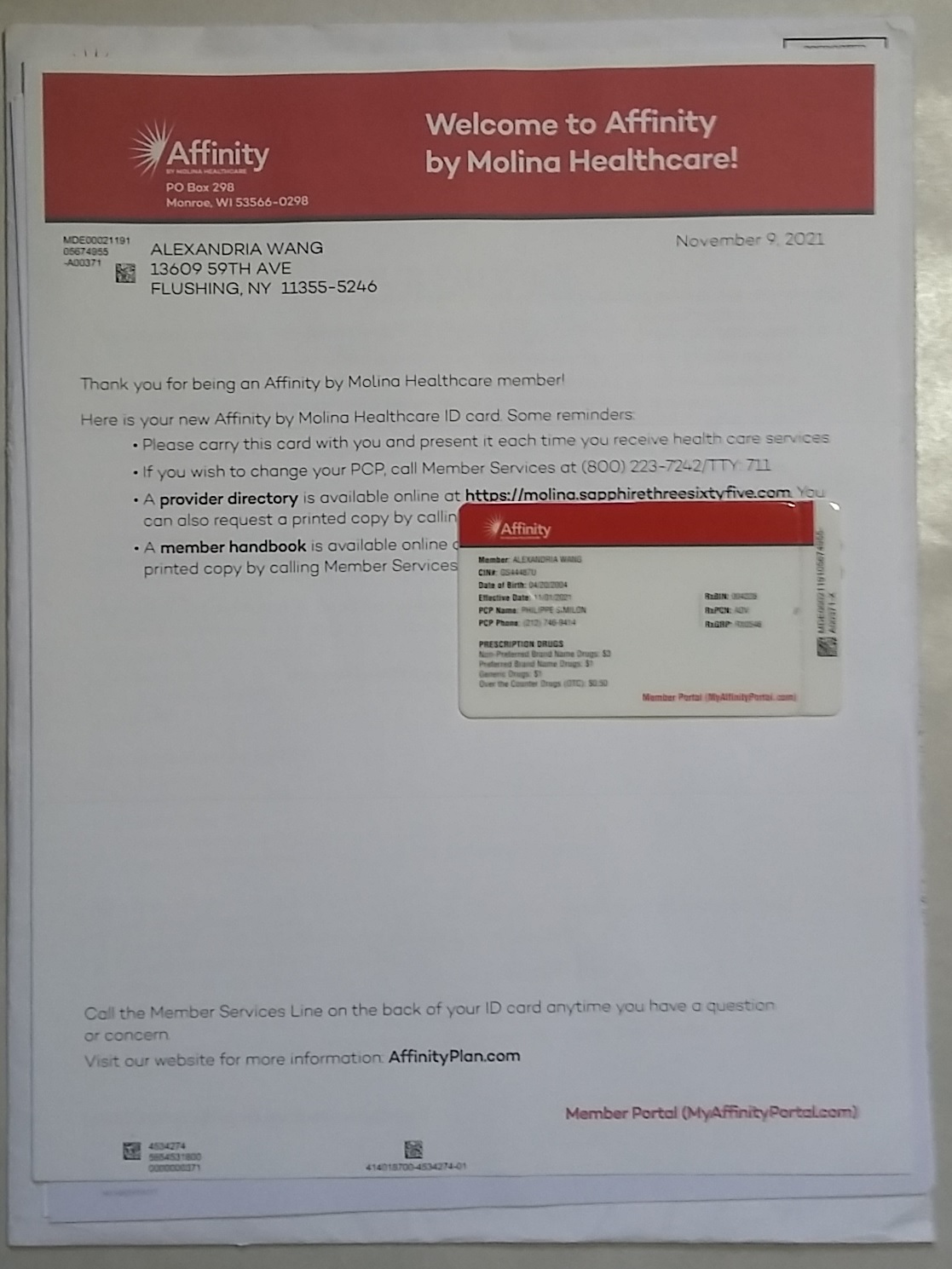 The parents did NOT apply for Affinity Molina Healthcare Insurance on behalf of Alexandria Wang, but a big mail came in to “Alexandria Wang” at the parents’ address on Nov. 16, 2021, and inside was included an Affinity Molina health insurance membership card which CLEARLY BUT WRONGLY prints AW’s DOB as “04/20/2004”. I assume that it’s the NYC ACS humanscums that deliberately create such a meticulously altered DOB to laundry Alexandria Wang’s identity down their chain of systematic children trafficking into prostitution and medical use of human-subjects.