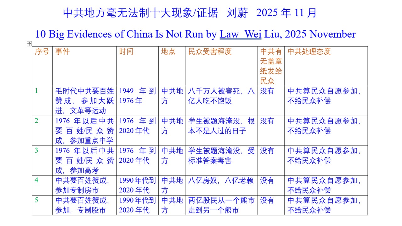 法制就是成文,就是文字,口说的不叫法制。中共地方号称有法制,其实毫无法制。以下是中共地方毫无法制的十大现象/证据。中共地方毫无法制证据/现象一:毛时代的大跃进,文革,上山下乡等运动都没有盖章纸发到百姓手里。你百姓说你参加这些运动,受害了,要中共赔偿。中共官员会说,“哪个中共官员或哪个中共党委强迫你参加文革了,你能拿出依据吗?”你百姓拿不出来。中共官员会说,“既然你拿不出来,就只能算你自愿参加,没人强迫你参加,也就没有补偿了。”