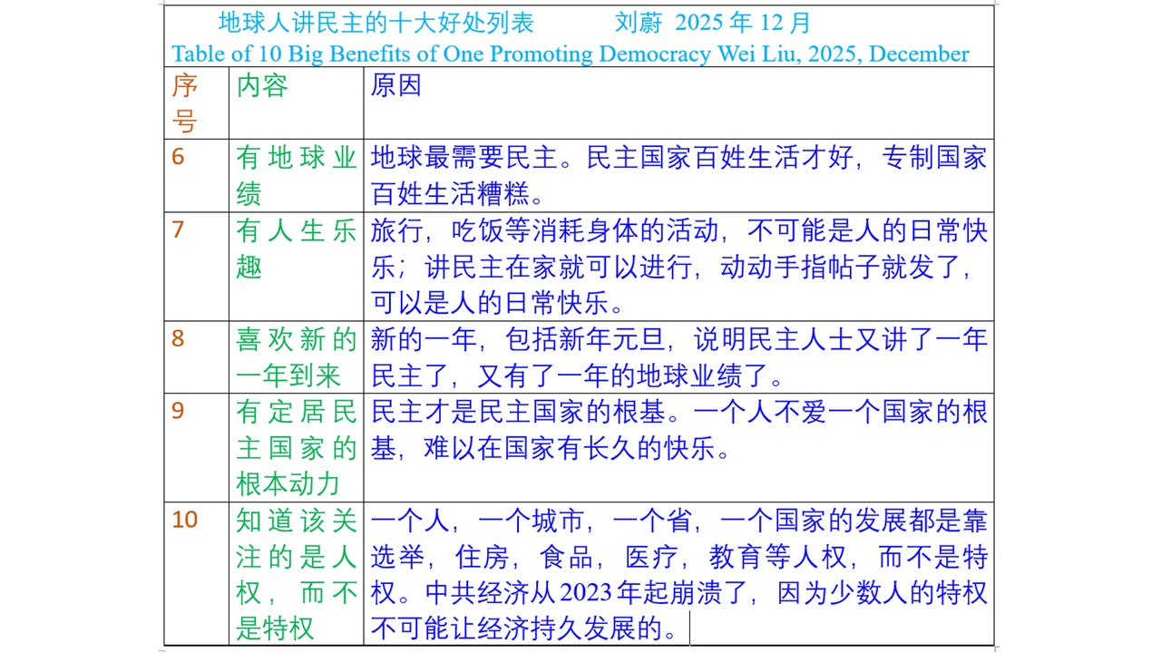 现在是2020年代。中共的统治可能还要继续1万年,因为华人的奴性。不要说半数以上人,哪怕中共环境10%的人,十个里面有一个如我刘蔚这样讲民主,中共一定会在一年内垮台。我也说清楚,我当然希望中共今天就垮台。多数华人也希望有民主,但为此愿意付出什么代价呢?有的人是中共人员瞪他一眼都怕。在美国,我碰到一位来自中共环境的医生,谈到那里不公平的事情。我说,“那你们该游行啊。”他说,“游行,谁敢啊?”我想游行,出去走两公里,一个小时事情,拍照片,视频放到网上,会很难吗?百姓游行了,中共会对百姓干什么?责备,处分计入档案,单位开除,关,打,杀?2020年代了,地球人至少不该怕中共人员责备了。看看,中共环境被习近平关了三年,还打毒针/疫苗,还在认为中共对他们好。所以,很不幸的,中共的统治可能还会继续1万年。 有坏人在,你就要与坏人同流合污吗?所以就算中共继续掌权1万年,我们一定每月每年都讲民主。地球从1776年第一个民主国家美国诞生,到现在2020年代,全球170个国家中,120个已经是民主国家了。民主才是地球发展的趋势。中共搞专制时间越长,其罪恶越大;正如中国皇帝制度越长,皇族们起的坏作用越大。以下是地球人讲民主的十大好处。 很多华人觉得讲民主没有用,这个观点大错特错了。我们看到最近20年90%新来欧美华人,失败海归,不讲民主嘛。讲民主的人都定居民主国家了,没听说那位讲民主的人失败海归了。拿到民主国家国籍,对于地球人,那就是天王山,这是地球人讲民主的好处一。来到民主国家,就可以上YouTube.在YouTube上一个月讲10分钟民主,三个月,讲30分钟民主,据我的观察,在2020年代就可以拿到民主国家的国籍。中共所谓高考能带来好前途完全是骗人的。2000年以来,中共地方城市房租一个月约2000元人民币,满18岁的城市人一个月没有一分钱收入的人大有人在。中共地方多数城市人是交不起房租的。同时中共环境的住房,里面与外面就差几度,住房里面的自来水也不能喝,就是地球上最差的住房。而民主国家如美国,房租一个月约700美元,2020年代美国平均收入是一个月两千多美元。在美国一个月的收入够交三个月房租的。所以拿到民主国家国籍对地球人就是决定命运的天王山。 地球人讲民主好处二:钱不再是问题。讲民主的人自然能看到中共的各种经济骗局,包括重点中学,高考,房市,股市,五险一金,海归,封控,毒针/疫苗,欧美华人单位,这些坑,掉进去一个平均损失就是100万元人民币。前面说了,中共从不发盖章纸到民众手里,最后一切活动算百姓自愿参加,不会有任何补偿或说法的。民主人士不被骗钱,挣的钱都是自己的。好比一个善于防守的足球队,不失球,那一但进球,比赛基本上就拿下了。 地球人讲民主好处三:知识不再是问题。民主涉及到受害的方方面面,一切的苦难从文革到股市,房市到毒针就是没有民主嘛,以至于数学,物理,化学,地理,历史,生物,英语,体育,经济等各科知识得不到适当的应用。譬如说中共环境建了那么多高楼,公路,铁路,机场,那每一样都是要有维护费的。不是一张椅子,坏了可以丢掉,买新的。40层的高楼坏了,丢到哪里去?这些都需要,数学,物理知识。中共环境的毒奶粉又涉及化学知识。所以我们讲民主几年,以上各方面知识已经积累了不少。再要去民主国家学习任何学科,至少美国大学会觉得我们是有实力的。 地球人讲民主好处四:分清好坏,明白责任。我说共产党下台,多数华人觉得我说话出格了,过分了。他们不知道这才是每个人该做的,是每个人的责任。在民主国家,投票选举是每个人的责任。投票就意味着一个人不选的,就算希望其不当选或者希望其下台。譬如说在美国,一个人投票给民主党,就是希望共和党下台;一个人投票给共和党,就是希望民主党下台。监督政府/党派是每位地球人的责任。中共环境没有选票,那我们也要表达我们的心声:共产党下台。 地球人讲民主好处五:有份终身职业。讲民主,教导圣经,在社区食堂工作都可以算一个人的工作,职业。至于说工作,职业是否带来收入,带来多少收入,那是另外一码事。民主国家有不少工作是义工,没有收入的。而收入未必需要工作,比如退休金,银行利息,都可以带来收入,但那不是工作或职业。就是说职业和收入是两码事,不能混为一谈。讲民主任何天在家里就能讲,家里有网络,也不花一分钱,是份终身职业。 地球人讲民主好处六:有了地球业绩。地球最需要的是民主。美国最伟大的发明不是别的,而是民主。1776年美国建国,确定了民主原则,成为世界上第一个民主国家。之后200年,地球在美国的带来下,到现在2020年代已经有120个国家成为了民主国家,50个国家是专制国家。生活好的国家就是有民主的国家,如欧美国家;生活差的国家就是专制国家,如中共环境,北朝鲜。一般行业如工厂,农场还谈不上地球业绩,讲民主就有了地球业绩。 地球人讲民主好处七:有了一大人生乐趣。每个人都该考虑,特别是年老后的乐趣。那些靠身体的乐趣,如长途步行,旅行,30岁以后都不现实,也对身体有害。旅行,拖着个行李箱步行,哪怕是带轮的行李箱,也没有不带行李箱轻松。网上发帖是任何年岁都能进行的互动,手指一动,一个帖子就出去了。在家里,任何岁数都可以进行。说到吃饭,吃的过多,肠胃负担过重,对身体有害。旅游,吃饭都不可能是长久的乐趣。讲民主在