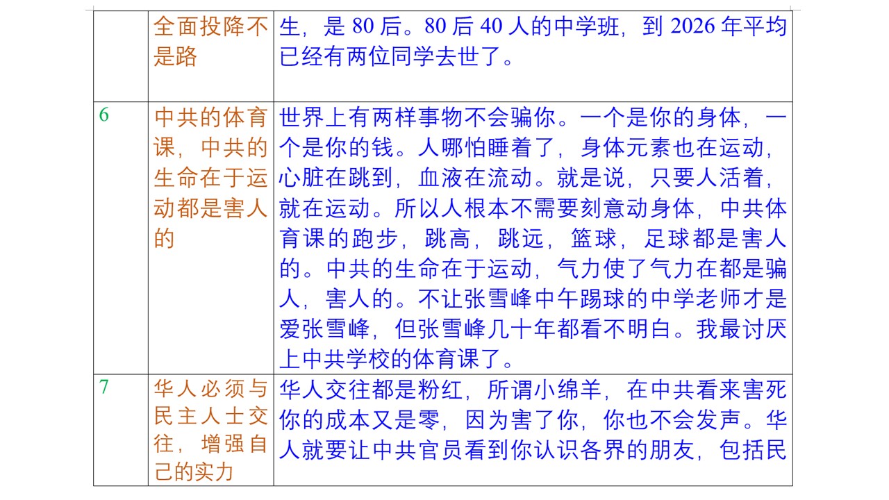 張雪峰的死亡引發了海內外華人的熱議。我們認為他的英年早逝有以下八點啟示。張雪峰去世啟示一:華人的眼睛不能只看着占地球陸地面積6%的中共環境。張雪峰老師壞的方面是眼睛只看着中共環境,2000年代以來,人都是地球人了,就是說可以去地球上任何國家生活了。譬如說我,哪怕我沒有一分錢,不會一個外語單詞,我就敢去日本,德國,意大利,比利時,美國,加拿大等民主國家求學,工作,生活。如果一個國家需要一個人帶着10萬美元去才能生活,那這樣的國家就不該去,不值得去。我們去任何國家都不是在哪裡賠錢,我們去那裡是一個月掙大錢,一個月掙上千美元。我劉蔚是重慶人,來到美國二十幾年,2020年代達到了美國的平均收入,每人每月兩千美元以上。2020年代在中共環境按每周工作40小時計算,平均收入就500元人民幣一個月,城市平均也就1000元人民幣一個月。 張雪峰去世啟示二:中共環境根本沒有所謂好專業,好學校。我們一再講,中共環境的住房,食品,貨幣,信息都是全球最差。清華,北大,工程學,力學,物理,化學,數學,英語,中文,歷史,地理,地質專業畢業,無論是買房租房都是裡面與外面就差幾度,住房裡面的自來水也不能喝的地球上最差的住房。中共環境占地球耕地面積6%,每年用掉地球50%的農藥,中共環境食品質量全球最差。北大,清華畢業仍然吃的是地球上最差的食品。泰國,歐美的食品比中共環境的食品質量好多了。那你還在中共環境高考,讀大學幹什麼? 張雪峰去世啟示三:中共的所謂疫苗就是毒針。張雪峰據說打了7針疫苗,包括3針科興疫苗/中共疫苗。2023年他因為胸悶住院。做直播被觀眾說他嘴唇發紫,可能他心臟不好。張雪峰聽到後很是不服。醫學講病人面貌,也就是中醫望聞問切的望。觀眾的觀察是準確的。張雪峰的身體早被中共的毒針搞壞了。習近平搞的病毒,包括三年封城,三針毒針,真是要把中共環境人除之而後快,已經害死了上億中國人。中共環境本來13億人,被病毒害死了上億人,現在最多只剩12億人了。 張雪峰去世啟示四:張雪峰是華人被中共病毒,包括中共毒針大面積害死的代表。如上所述,中共病毒害死了上億中國人。張雪峰是80後,1984年出生。80後號稱乖巧,也就是適應中共專制吧,結果80後的死亡率達到了5%。就是說40人的中學班,平均已經有2人死亡了。 張雪峰去世啟示五:華人對中共一味服從,全面投降不是路。對中共乖巧,所謂小綿羊,那它真把你當小綿羊,對於封城,核酸,行程碼,疫苗/毒針,你通通服從,不敢說一個不字,那結果只能是被害死。張雪峰就是這樣的例子。共產黨不願談的民主,自由,人權,他就不敢談。共產黨要打台灣,他還說,“槍聲一響,我捐五千萬。”中共環境人包括80後,90後對中共全面投降,所謂小綿羊,那就象小綿羊一樣被害死了。80後40人的中學班,到2026年平均已經有兩位同學去世了。 張雪峰去世啟示六:中共的體育課,中共的生命在於運動都是害人的。世界上有兩樣事物不會騙你。一個是你的身體,一個是你的錢。如果在一個地方包括單位,你的錢不如你預期,那你就該換地方。為什麼眼睛就看着占地球陸地面積6%的中共環境?完全可以來泰國,日本,歐美國家嘛。人哪怕睡着了,身體元素也在運動,心臟在跳到,血液在流動。就是說,只要人活着,就在運動。所以人根本不需要刻意動身體,中共體育課的跑步,跳高,跳遠,籃球,足球都是害人的。我最討厭上中共學校的體育課了。記得在四川重慶上中共學校體育課時間,我就盼望下雨,體育老師拿象棋,圍棋來給我們學生下。體育老師只帶一副圍棋來,說不定還是他自己家裡的,全班50來名同學,我也沒有機會下圍棋。 張雪峰2026年3月22日跑了7000米,3月24日又在跑步機上跑,結果跑死了。中共體育課的1000米考試讓我特別難受,象要我命似的。中共環境學校1000米跑步考試死亡的人都有。人100來斤,跑1000米不是鬧着玩的,跑1000米是可能跑死人的,張雪峰還跑7000米。2026年我去跑個1000米可能就死了,所以我不會去跑。 40來歲的張雪峰節目裡說,“我讀中學時特愛踢足球,老師說中午不能踢球,我也踢球。被老師罰站,我不在乎,我還是踢球。”張雪峰十幾歲中學時不明白,怎麼二十幾年後,經歷了那麼多,在身體健康方面還是十幾歲時的水平。他當年老師估計40來歲吧。他老師不讓他踢球才是愛他的。今天2026年華人經歷那麼多苦難,根本原因就是好壞不分。 張雪峰去世啟示七:華人必須與民主人士交往,所謂保命保財。華人看到中共的局長,書記就想交往,所謂應酬,那才是害你的。華人看到民主信息,民主人士就躲避,要給中共官員一個服從,小綿羊的印象。那在中共看來,害你的成本就是零,因為你到死都不敢發聲。華人就要讓中共官員看到你認識各界的朋友,包括民主人士,中共人員要來害你,會被你揭露其罪惡,那中共官員就不大敢來害你了。民主人士會告訴你反對中共封城,不打中共疫苗/毒針,不跑步,不打球,不在中共環境買房,買車,少受一系列的害。2020年代華人該明白了,粉紅是害人的,民主人士是愛人的。華人包括張雪峰的苦難就在於一輩子沒明白誰是害他的,誰是愛他的。
