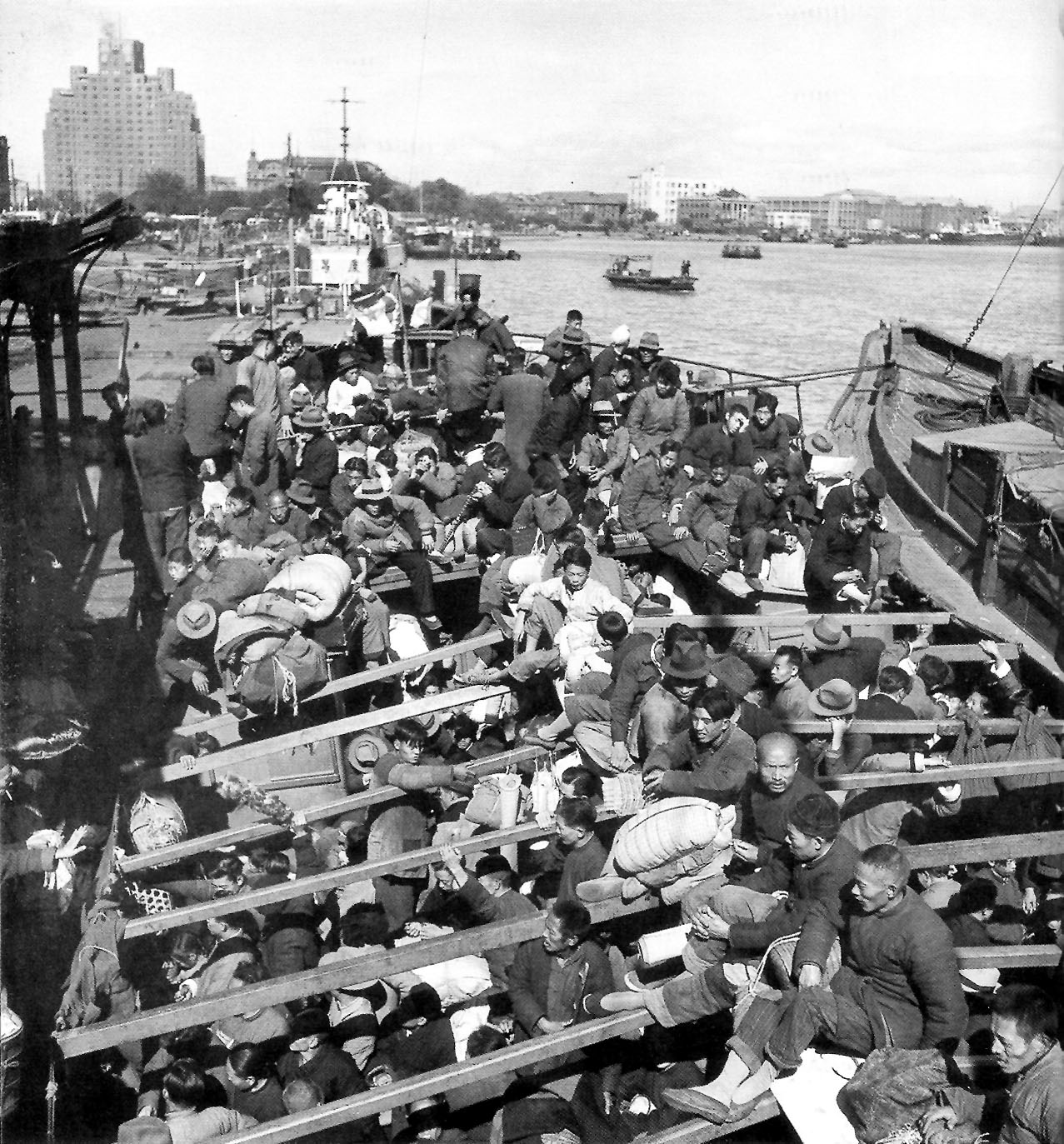 一整排的兵用力扔手榴彈的時候,彷佛漫天灑下大批糖果,然後戰壕里的林精武看見對面“整片凹地像油鍋一樣的爆炸”,可是海浪般一波又一波的人,一直湧上來,正對着發燙的炮口。 前 面的幾波人,其實都是“民工”,國軍用機關槍掃射,射到手發軟;明知是老百姓,心中實在不忍,有時候就乾脆閉起眼睛來硬打,不能不打,因為“你不殺他,他 就要殺你”。機關槍暫停時,探頭一看,一條壕溝里就橫着好幾百具屍體。他們開始清理戰場,搬開機槍射口的屍體,用濕布冷卻槍管。 抗日名將黃百韜的國軍部隊在十米寬的河邊構築了強大的防禦工事,每一個碉堡都布滿了機關槍眼,對着河;民工就一波一波地沖向槍口,達達聲中屍體逐漸填滿了河,後面的解放軍就踩着屍體過河。   1949年11月,在共軍炮火聲下,上海一艘原給美海軍提供補養的船上,擠滿了行李簡單的難民。(美國記者傑克‧伯恩斯)