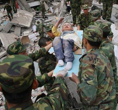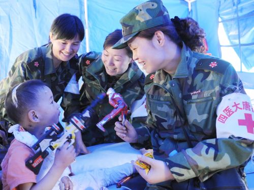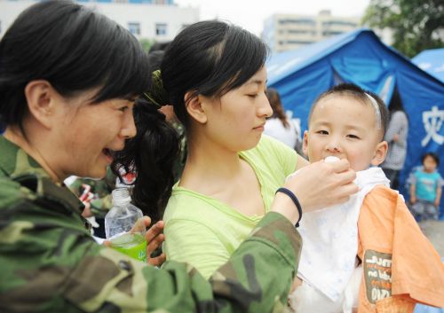 5月20日,解放軍某部的醫護人員(左)給3歲的郎錚餵水。 3歲的郎錚說:“我也要當警察,和爸爸一起去救叔叔阿姨”。 向士兵敬禮的孩子。