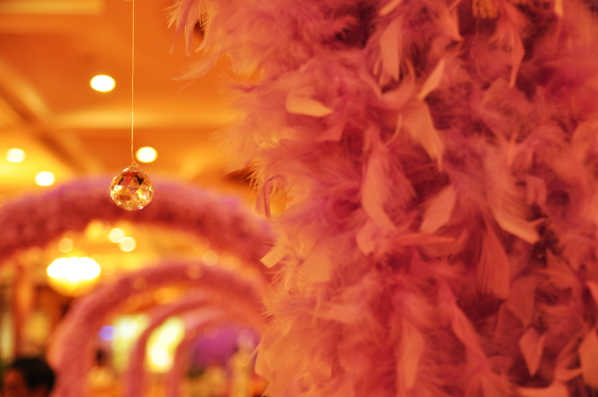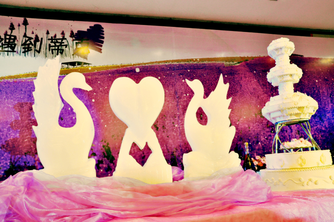 女孩的呼喚,縈繞着全場,浪漫的音樂奏響,追光凝聚,幸福之門打開,新人沐浴在祝福中,輕盈着紛飛的紫色羽毛,偶爾還有漂亮“螢火蟲”的熒光,星星點點,他們款款走來……開始了第一個環節,這是純西式的環節,環節里,莊嚴的宣誓,揭頭紗,交換戒指,體現的是婚禮的莊重,肅穆,全場來賓安靜的感受着新人的婚禮,祝福着……