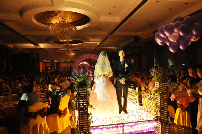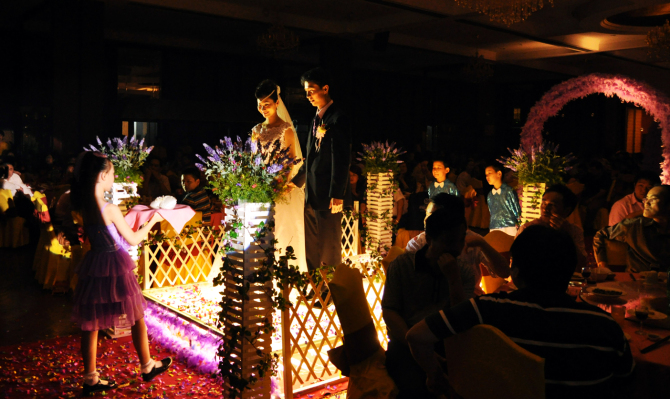 全場暗燈,追光直射,我對dj說,響第一首音樂,司儀開場,500多人的現場,安靜的讓人肅穆的讓人莊重的讓人感動,我拿起話筒,給美好的愛情故事,做了個序,童謠響起,靈動的女孩,穿着紫衣出場,那是薰衣草的天使,愛情的象徵,童音里質樸的語言,英國童謠的風格,帶來了異國的浪漫,同時,天真,純潔,傾灑着紫色的薰衣草花碎,清香四溢,燈光伴隨着跳躍着,音樂伴隨着歡呼着,有沒有人知道,婚禮的開場,竟然是如此童真趣談聖潔美滿,天使坐在了全場中心的水晶舞台上,聽着薰衣草的話,話中告訴着羅曼蒂克的愛情,天使呼喚着幸福之門的開啟,愛情的咒語“羅曼蒂克”……