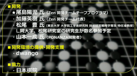 新浪體育訊 3月1日,日本著名視頻網站niconico直播了一場關於圍棋的新聞發布會,宣布“DEEP ZEN GO”項目啟動,日本要以超越谷歌的阿爾法圍棋為目標,打造世界最強圍棋軟件。 日本DWANGO董事長川上量生、日本棋院理事長和田紀夫、日本著名圍棋程序ZEN研發者加藤英樹、將棋軟件PONANZA開發者山本一成氏、東京大學工學研究科專業特聘准教授松尾豐氏共同出席了發布會。 DeepZenGo 支持力量強大